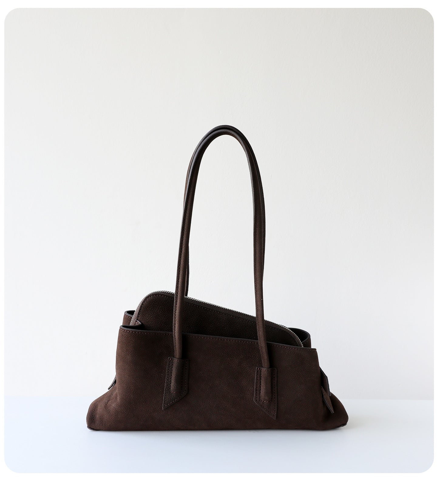 حقيبة كتف أنيقة مصنوعة من جلد سويدي فاخر بلون بني شوكولاتة غني، بتصميم بسيط وأنيق. تتميز بمقابض طويلة وهيكل ناعم، مما يمنحها لمسة من الرقي والعملية اليومية، لتكون مثالية لإطلالات النهار الأنيقة أو إطلالات المساء العفوية.