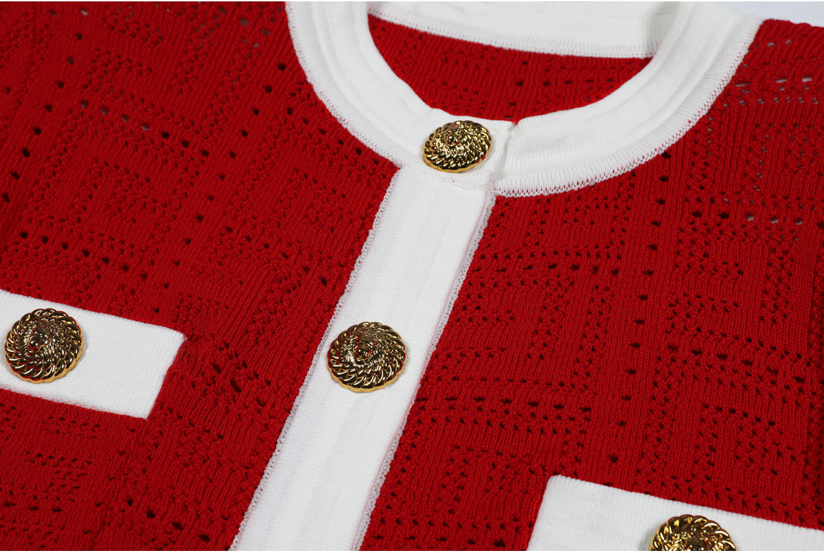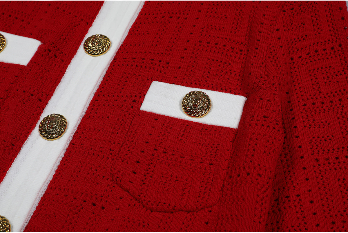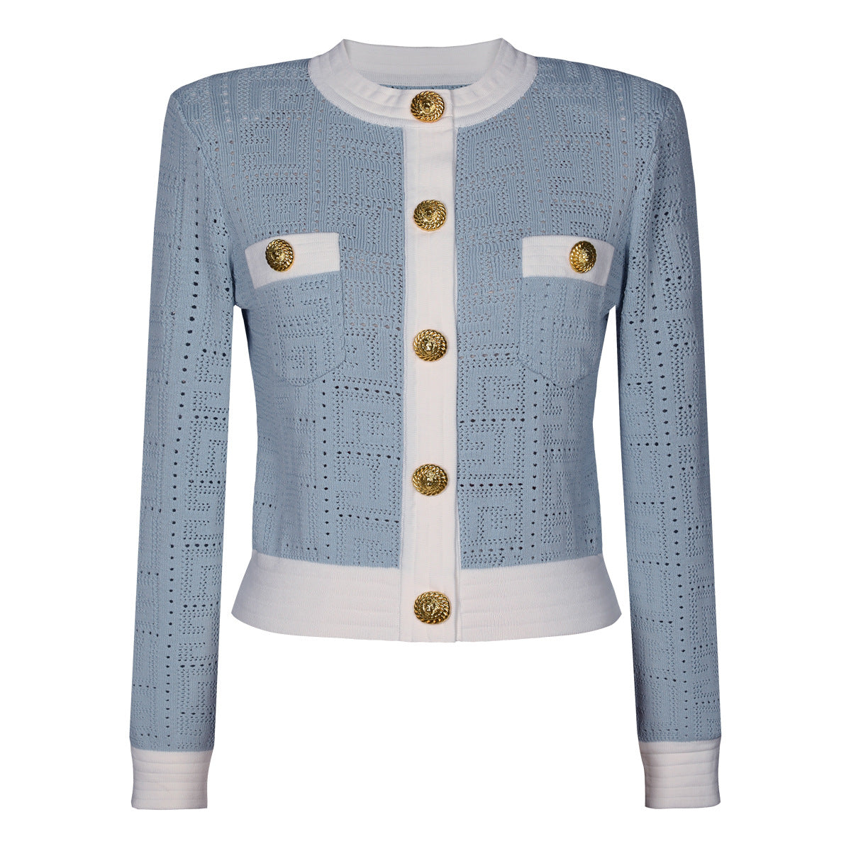 بلوزة محبوكة مصممة خصيصاً بأكمام طويلة، وحواف بيضاء جريئة متباينة، وأزرار ذهبية مزخرفة. تتميز بجيوب أمامية صغيرة لإطلالة أنيقة وعصرية، مثالية لإطلالات يومية أنيقة.