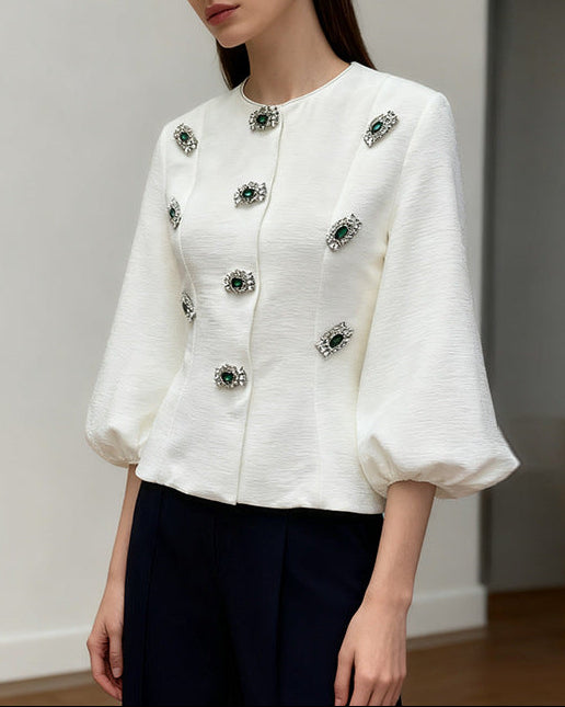 بلوزة سوداء أنيقة بأكمام منفوخة واسعة وزخارف زهرية كريستالية متقنة مع مركز أخضر زمردي. أنيقة وراقية، تضفي لمسة من التألق، مثالية للسهرات أو المناسبات الأنيقة.