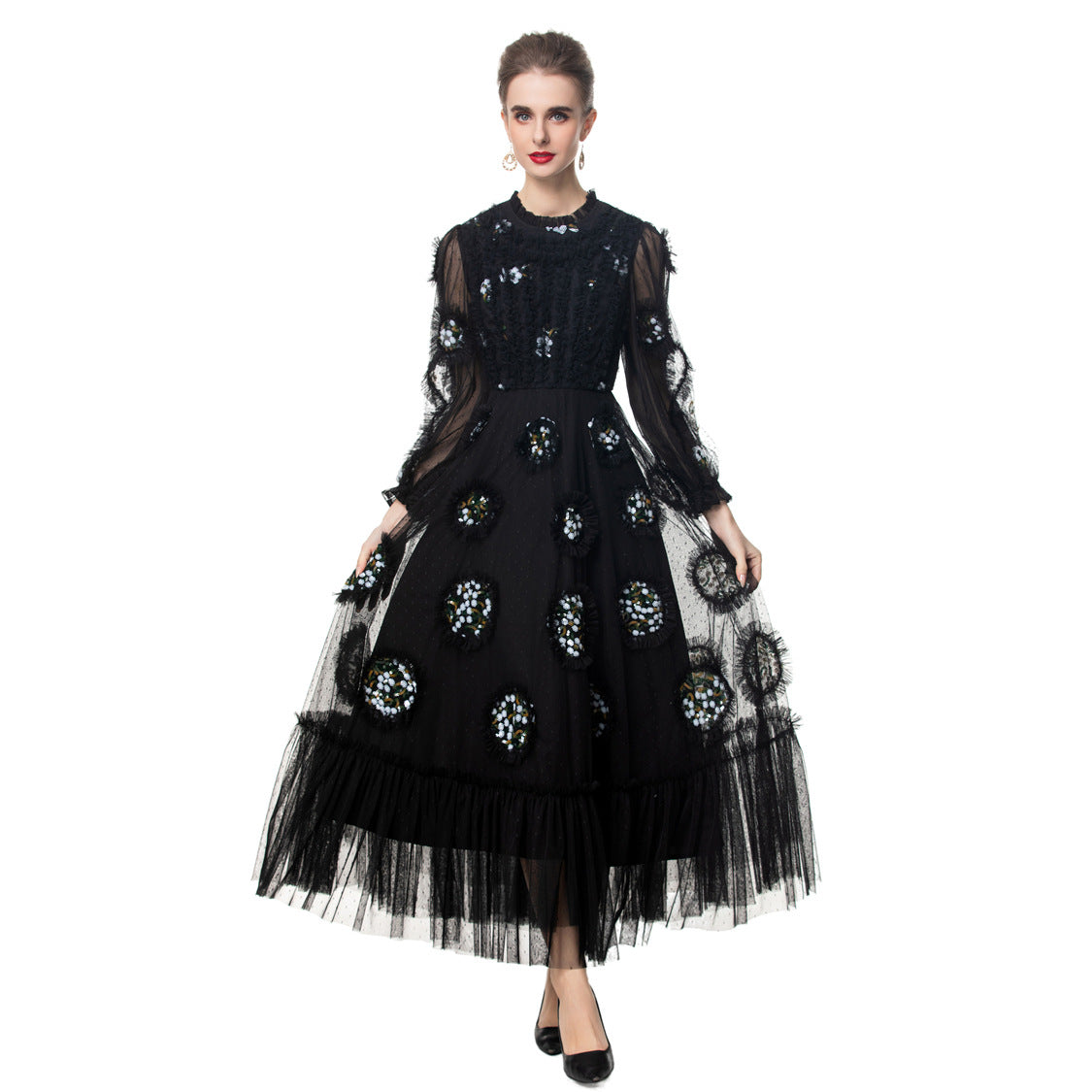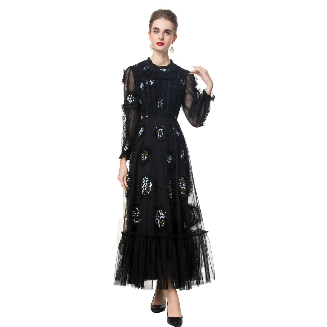 فستان أسود ساحر من التول، مزين بتطريزات زهور دقيقة وتفاصيل شبكية ناعمة متعددة الطبقات. أكمامه الشفافة وتنورته الواسعة تضفيان عليه لمسة من الأناقة، ما يجعله قطعةً مثاليةً للسهرات.