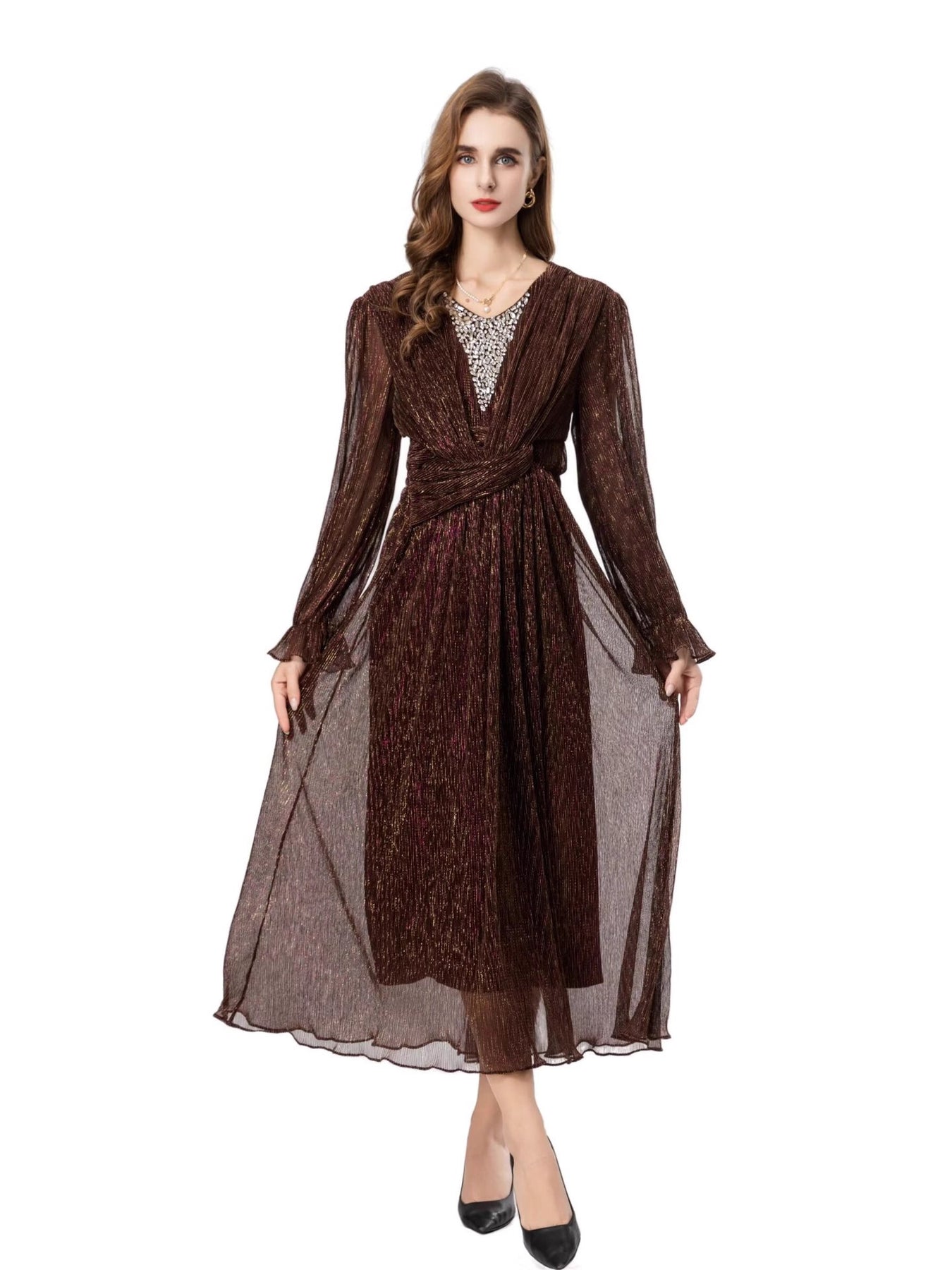 فستان شيفون برونزي رائع بكسرات، يتميز بخصر ملفوف منسدل ولمسة نهائية لامعة. انسياب القماش الناعم وتفاصيل الرقبة على شكل حرف V تُضفيان عليه مظهرًا أنيقًا ومستطيلًا، مثاليًا للأمسيات الرسمية أو المناسبات الاحتفالية.