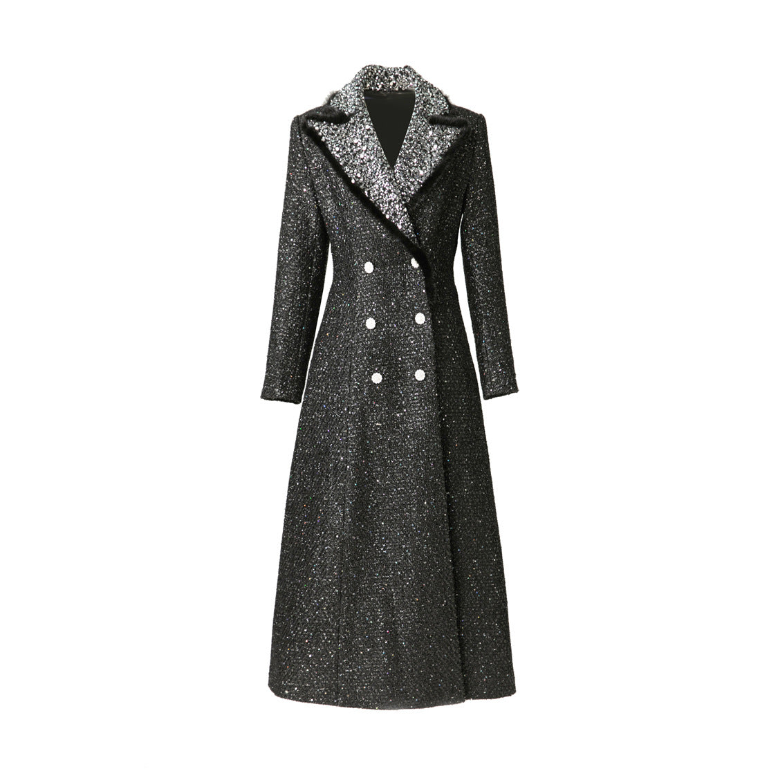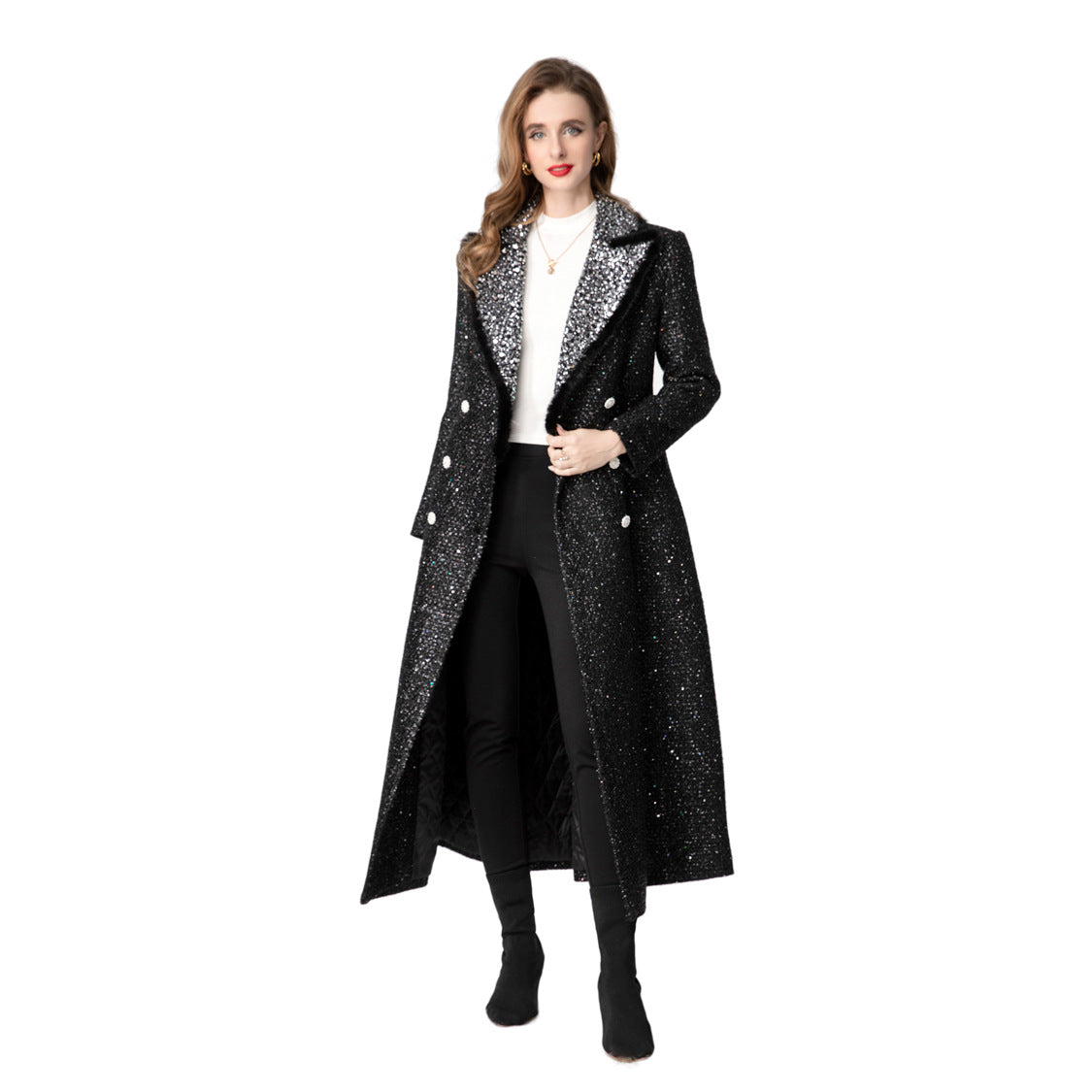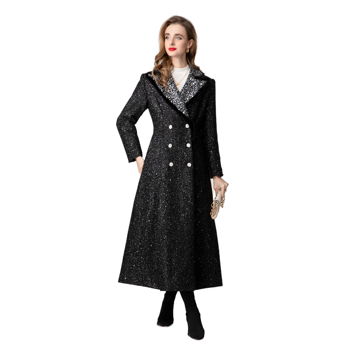 فستان أسود لامع رائع، يتميز بياقة متباينة مطرزة بالترتر، وقصة مزدوجة الصدر. مصمم لإطلالة عصرية راقية، مع حاشية أنيقة واسعة، مثالية للمناسبات المسائية أو المناسبات الفاخرة.