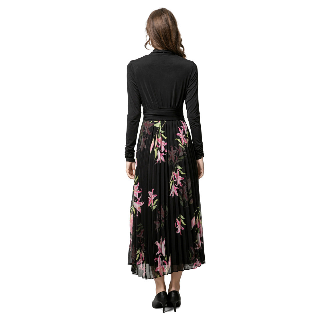 فستان شيفون أسود أنيق، يتميز بفتحة صدر ملفوفة على شكل حرف V وتنورة مطوية واسعة مزينة بطبعات زهور وردية ناعمة. أكمام طويلة وخصر مشدود يمنحانكِ إطلالة أنثوية راقية، مثالية للسهرات أو إطلالات النهار الأنيقة.
