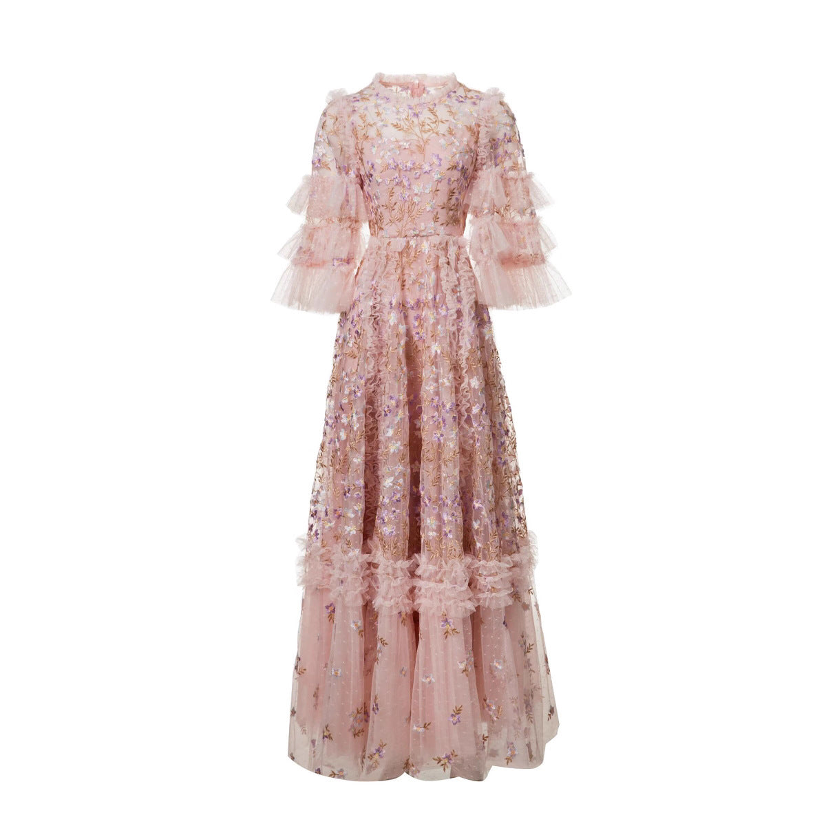 فستان وردي ساحر، مصمم بطبقات من التول الشفاف وتطريزات زهرية براقة من الترتر. أكمامه المتدرجة المنسدلة وتنورة طويلة تُضفي عليه لمسة رومانسية ساحرة، مثالية للأمسيات والاحتفالات الخاصة.