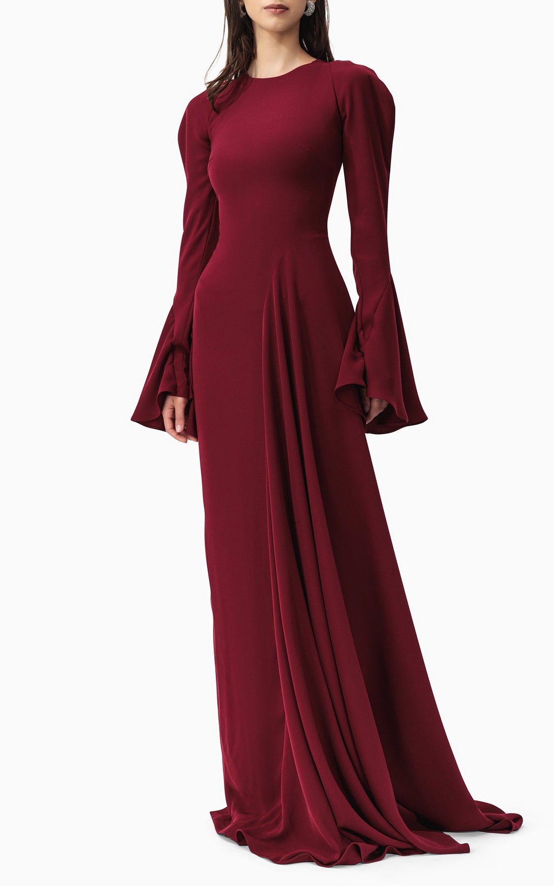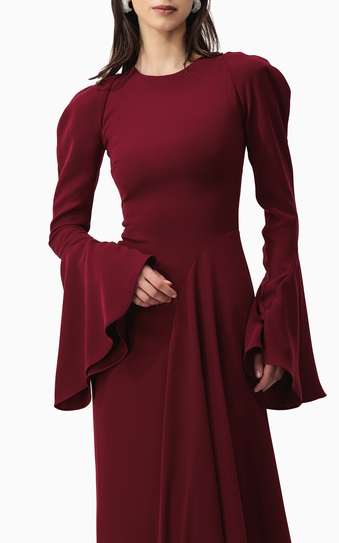 فستانٌ عنابيٌّ داكنٌ آسرٌ بأكتافٍ منفوخةٍ منحوتة، وأكمامٍ طويلةٍ أنيقةٍ مع أكمامٍ واسعةٍ مثيرةٍ، وثنياتٍ ناعمةٍ متدرجةٍ تُضفي عليه لمسةً من الحركة والرقي. خيارٌ جريءٌ وأنيقٌ في آنٍ واحدٍ للمناسبات المسائية.