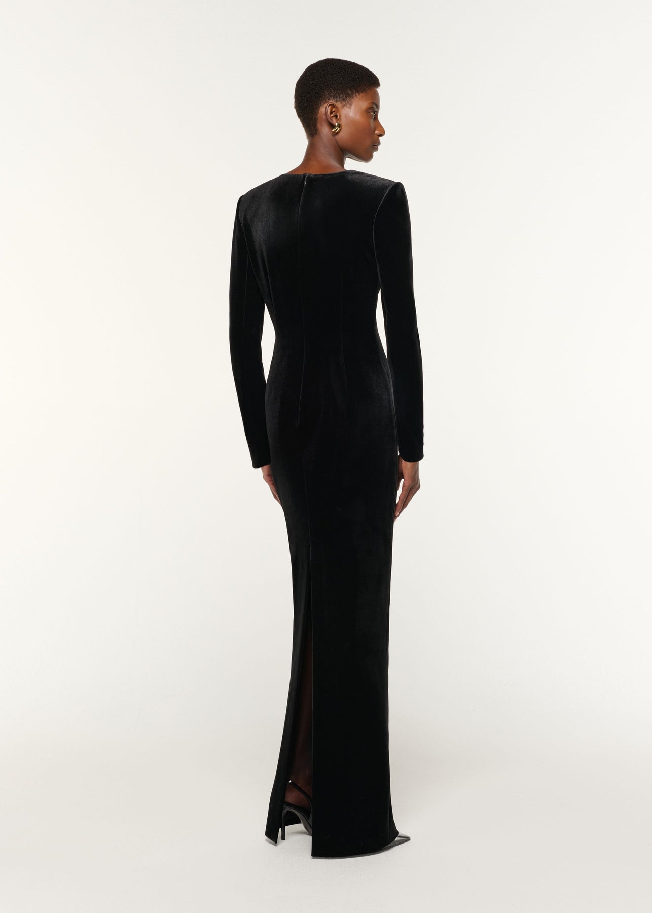 فستان أسود مخملي أنيق متوسط الطول، يتميز بقصّة منحوتة، وأكمام طويلة ضيقة، وفتحة رقبة غير متماثلة ملفتة، مزينة بزخارف ذهبية لامعة. أنيق، عصري، وساحر، مثالي للمناسبات المسائية.