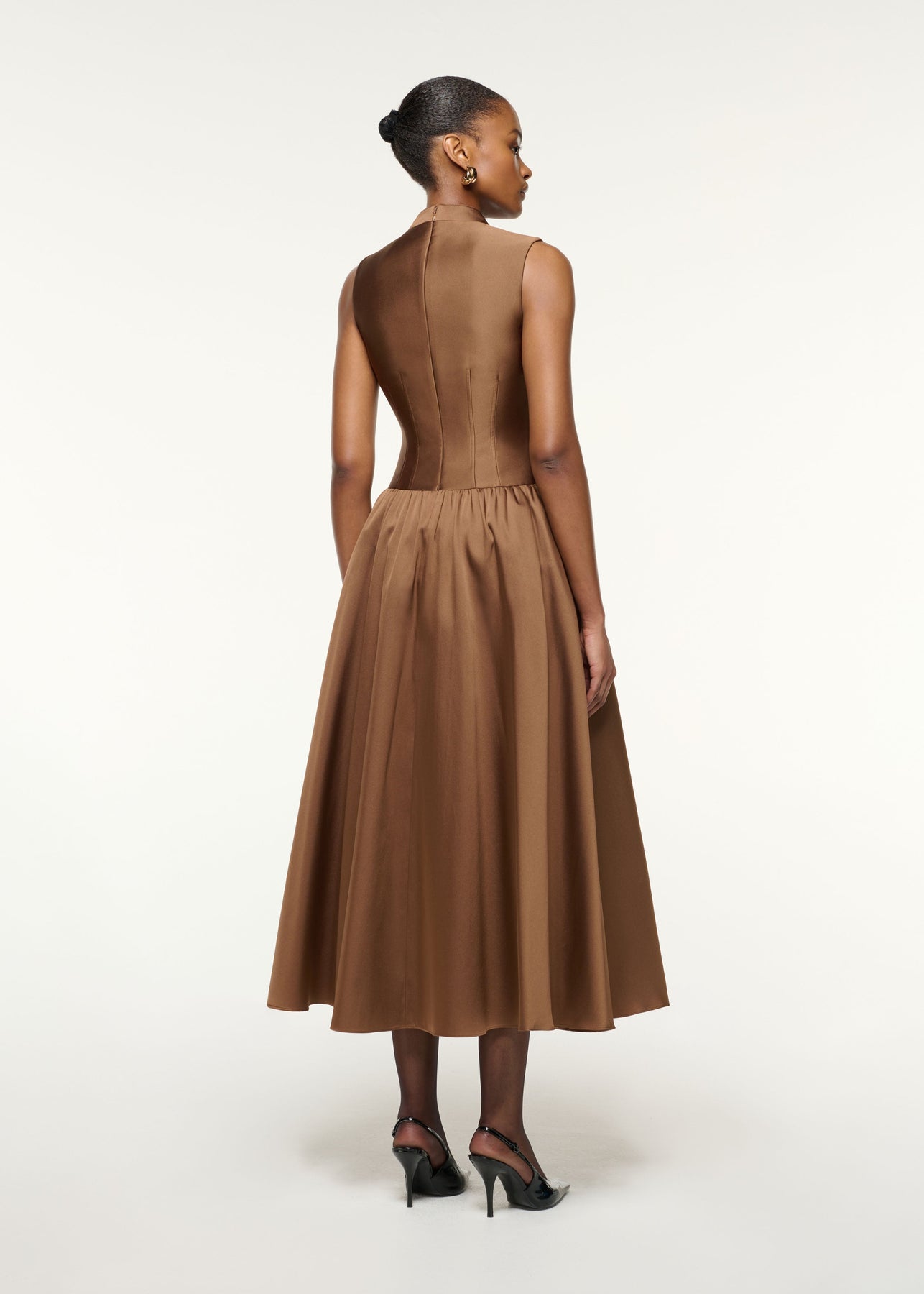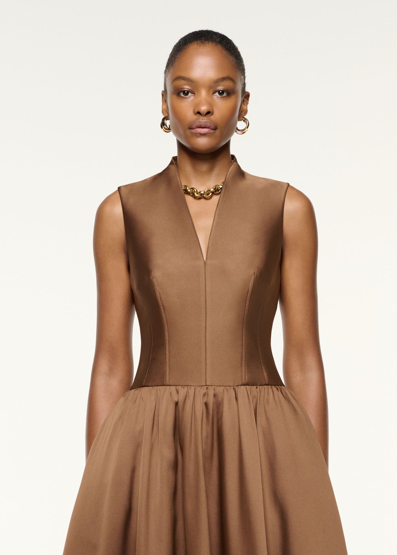 فستان ميدي أنيق بلون بني فاتح، يتميز بصدرية بدون أكمام بتصميم منظم، وفتحة رقبة على شكل حرف V أنيقة، وتنورة واسعة منسدلة ناعمة. أنيق، بسيط، ومثالي لإطلالات نهارية أو مسائية راقية.