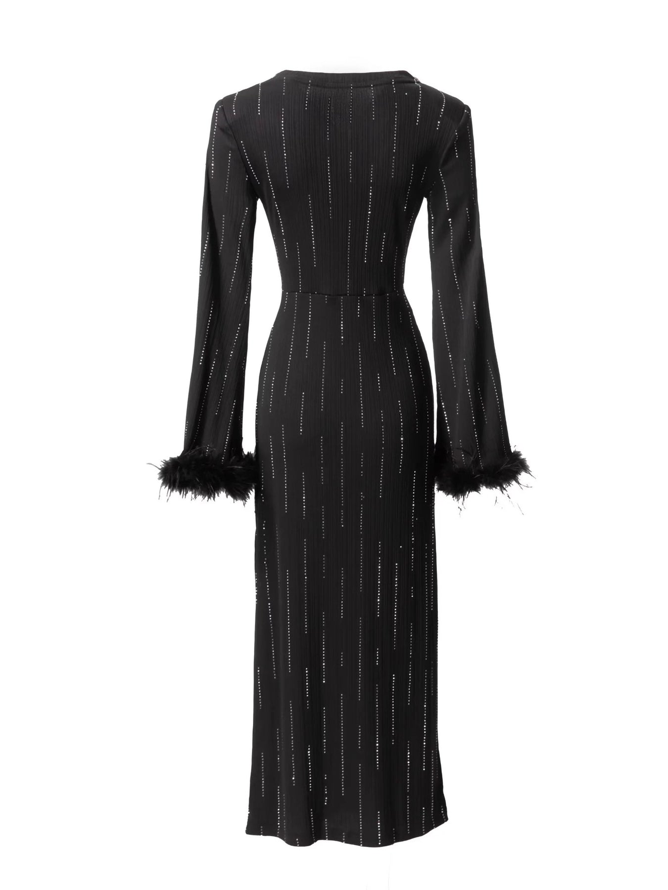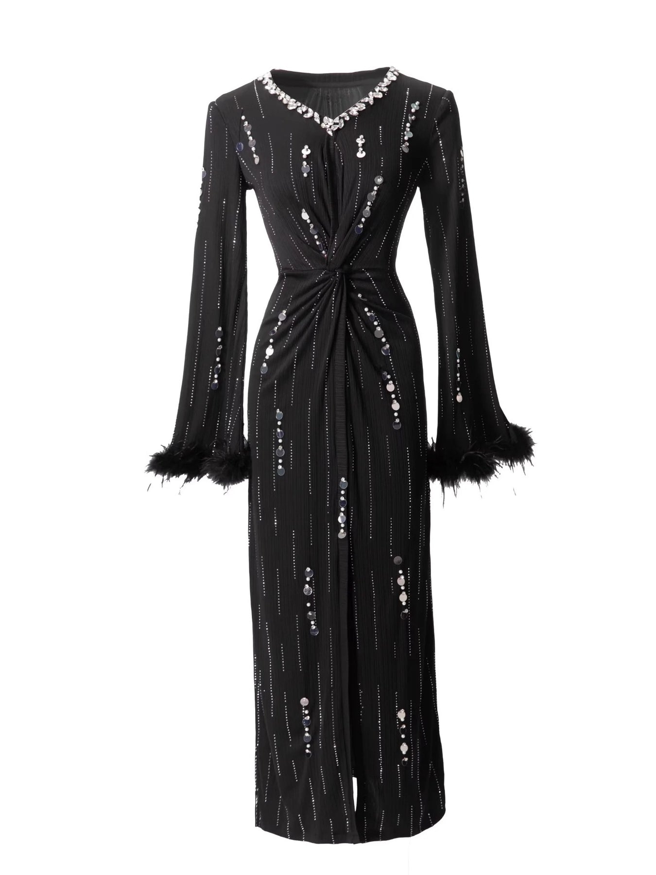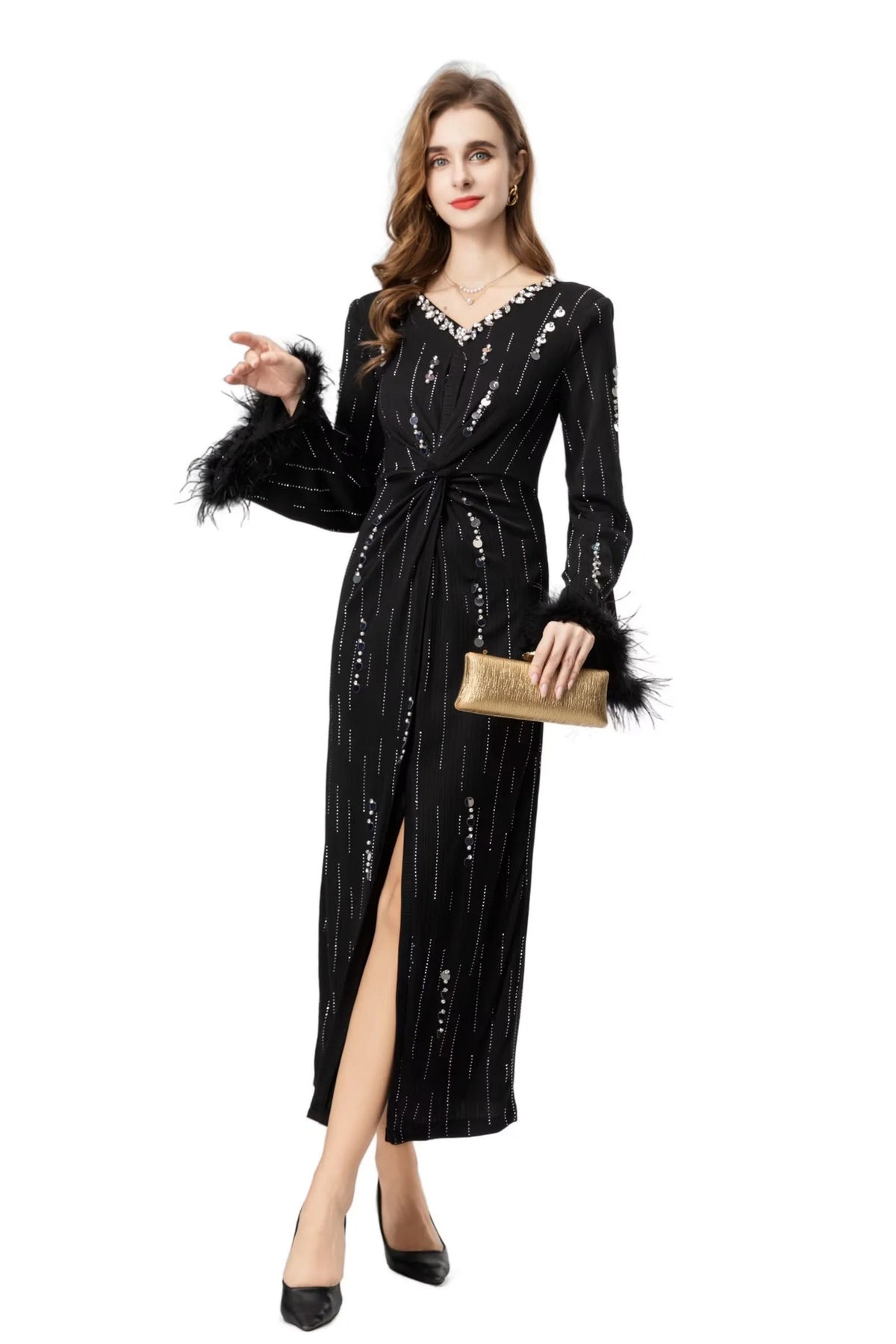 فستان سهرة أسود أنيق بتطريزات لامعة، وتفاصيل أمامية ملتوية، وشق يصل إلى الفخذ لإطلالة أنيقة وطويلة. مزين بأكمام جرسية أنيقة مزينة بالريش لإضفاء لمسة من الأناقة الجريئة.