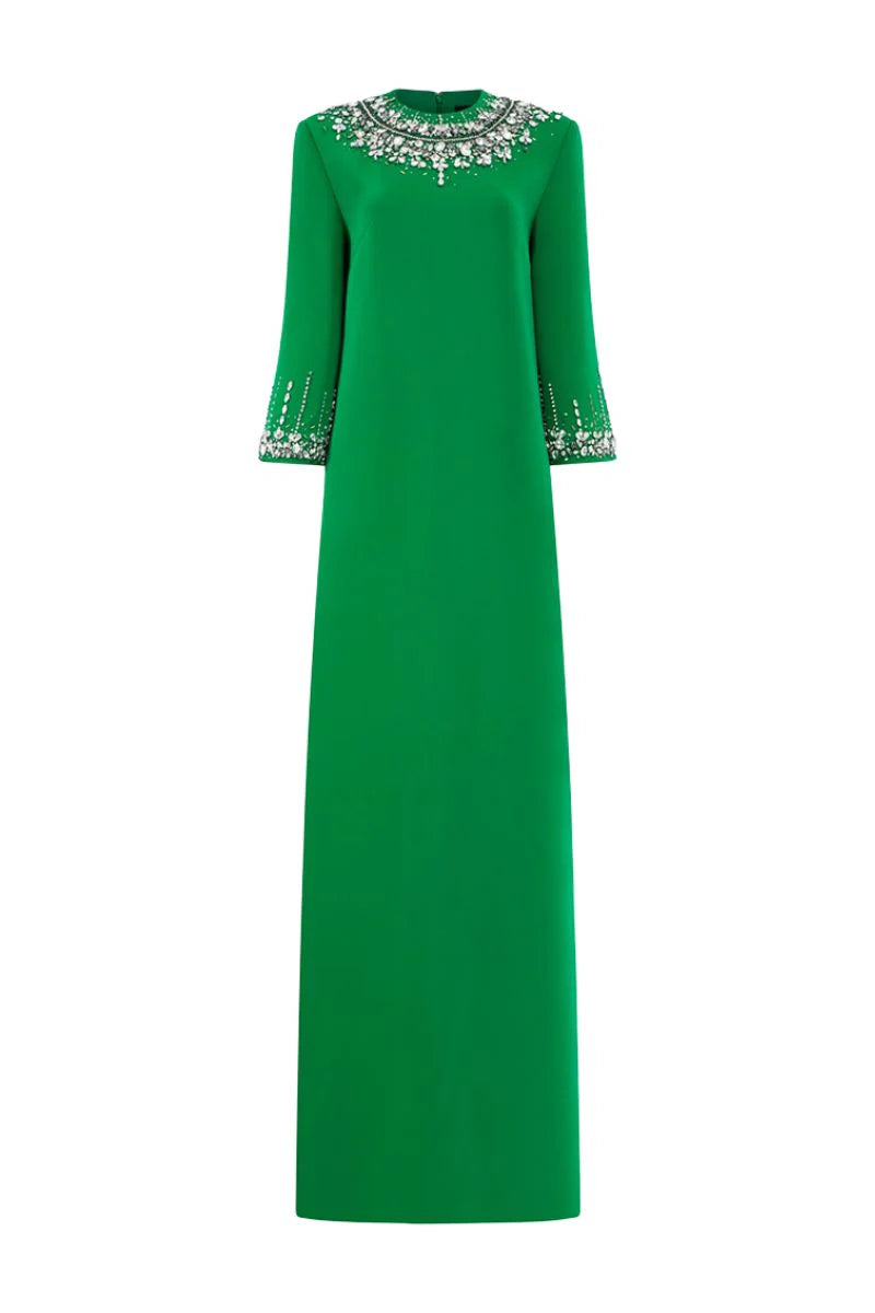 فستان زمردي أنيق، يتميز بياقة عالية مزخرفة بإتقان، وأكمام بطول ثلاثة أرباع مزينة بتفاصيل كريستالية متناسقة. تصميمه البسيط والمستقيم يُبرز تطريز الخرز المتقن، ليمنحه أناقة راقية وعصرية، مثالي للأمسيات الرسمية والاحتفالات الراقية.