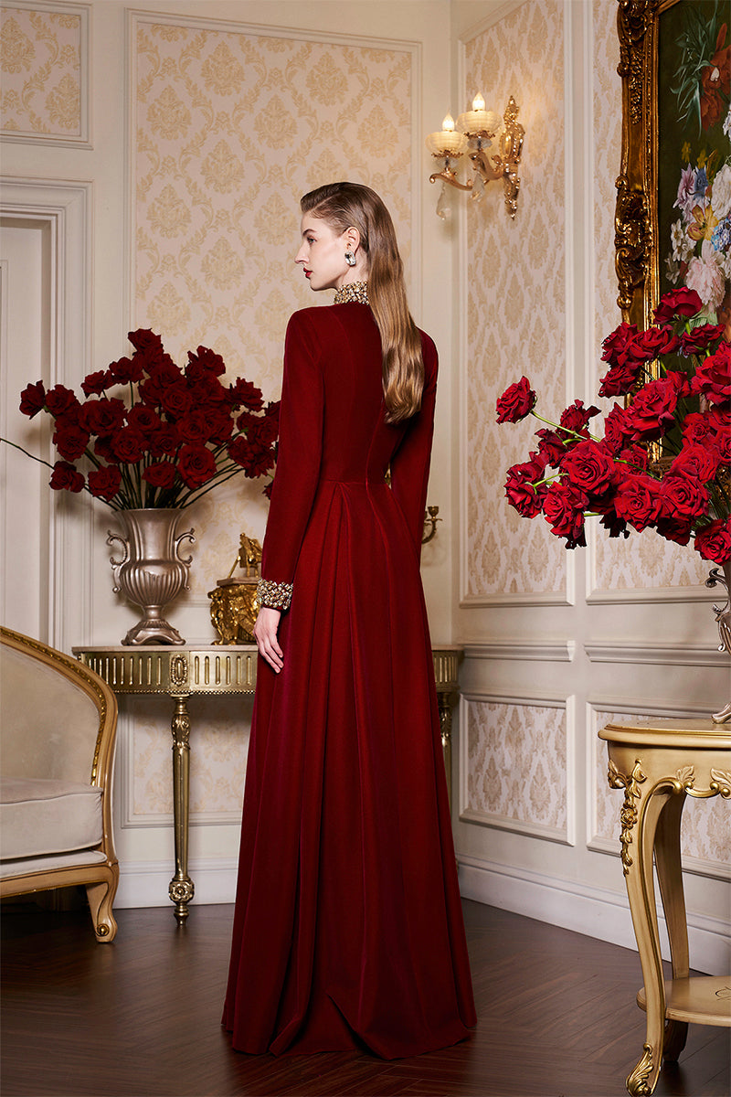 فستان مخملي فخم بلون العقيق الأحمر، يتميز بياقة عالية مزخرفة بإتقان وأساور متناسقة مرصعة بالجواهر. أكمامه الطويلة وتنورة واسعة ناعمة تُضفي عليه لمسةً أنيقةً وجذابة، مثالية للأمسيات الرسمية، وحفلات الشتاء، والمناسبات الفاخرة الخالدة.