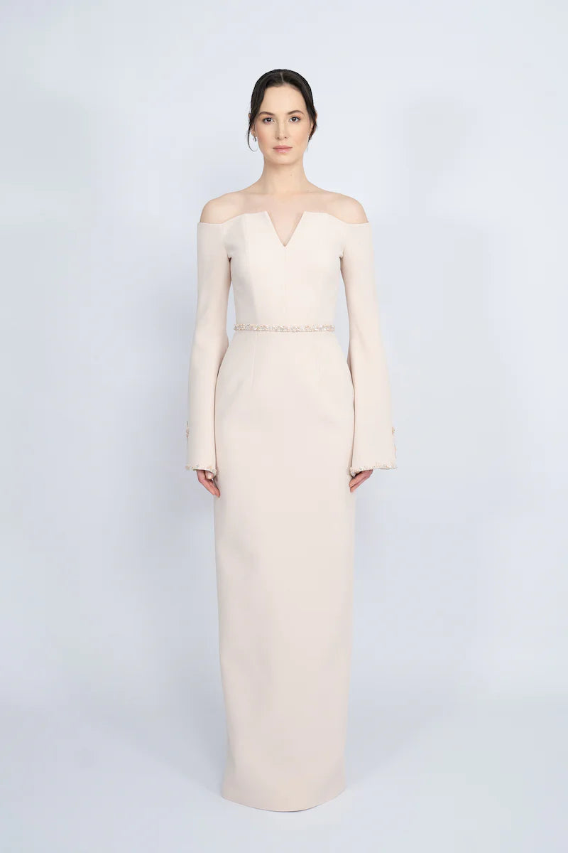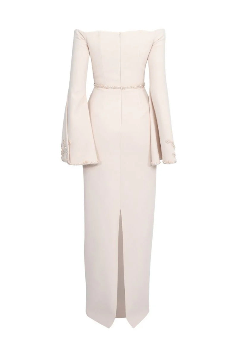 فستان وردي ناعم بقصة عمودية، يتميز بفتحة رقبة أنيقة مكشوفة الكتفين وأكمام واسعة مثيرة مزينة بتطريز زهري رقيق. تصميمه الأنيق والممدود يُضفي عليه لمسةً رومانسيةً أنيقة، مثالي للمناسبات الراقية والخطوبة والأمسيات العصرية الأنيقة.