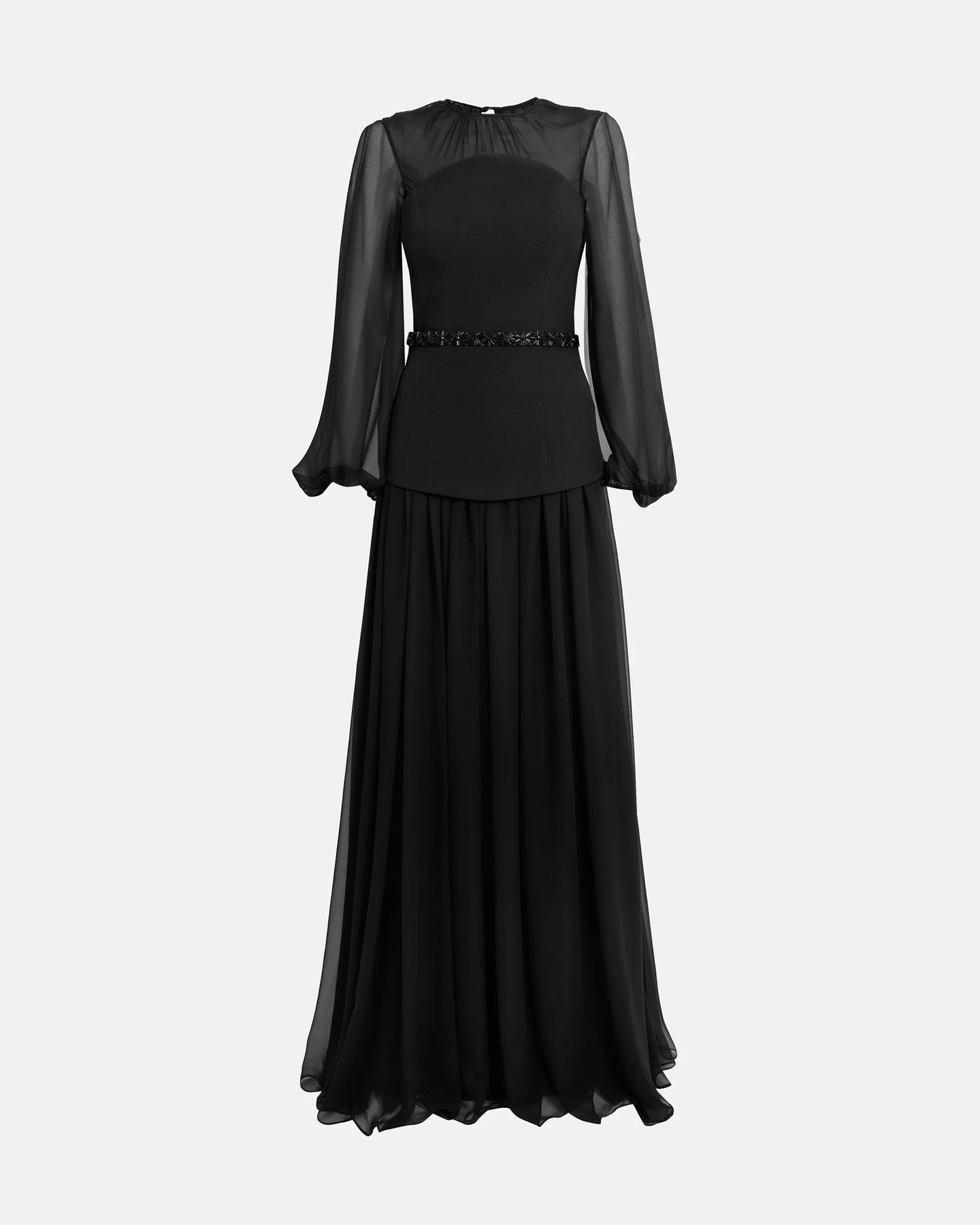 فستان أسود أنيق بأكمام شيفون ناعمة وشفافة، وصدرية ضيقة مزينة بخصر مزخرف بدقة. يكتمل الفستان بتنورة مطوية انسيابية، أنيقة، متواضعة، وعصرية، تناسب المناسبات المسائية الراقية.