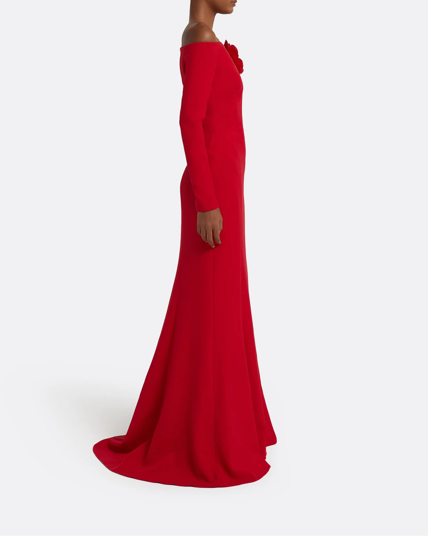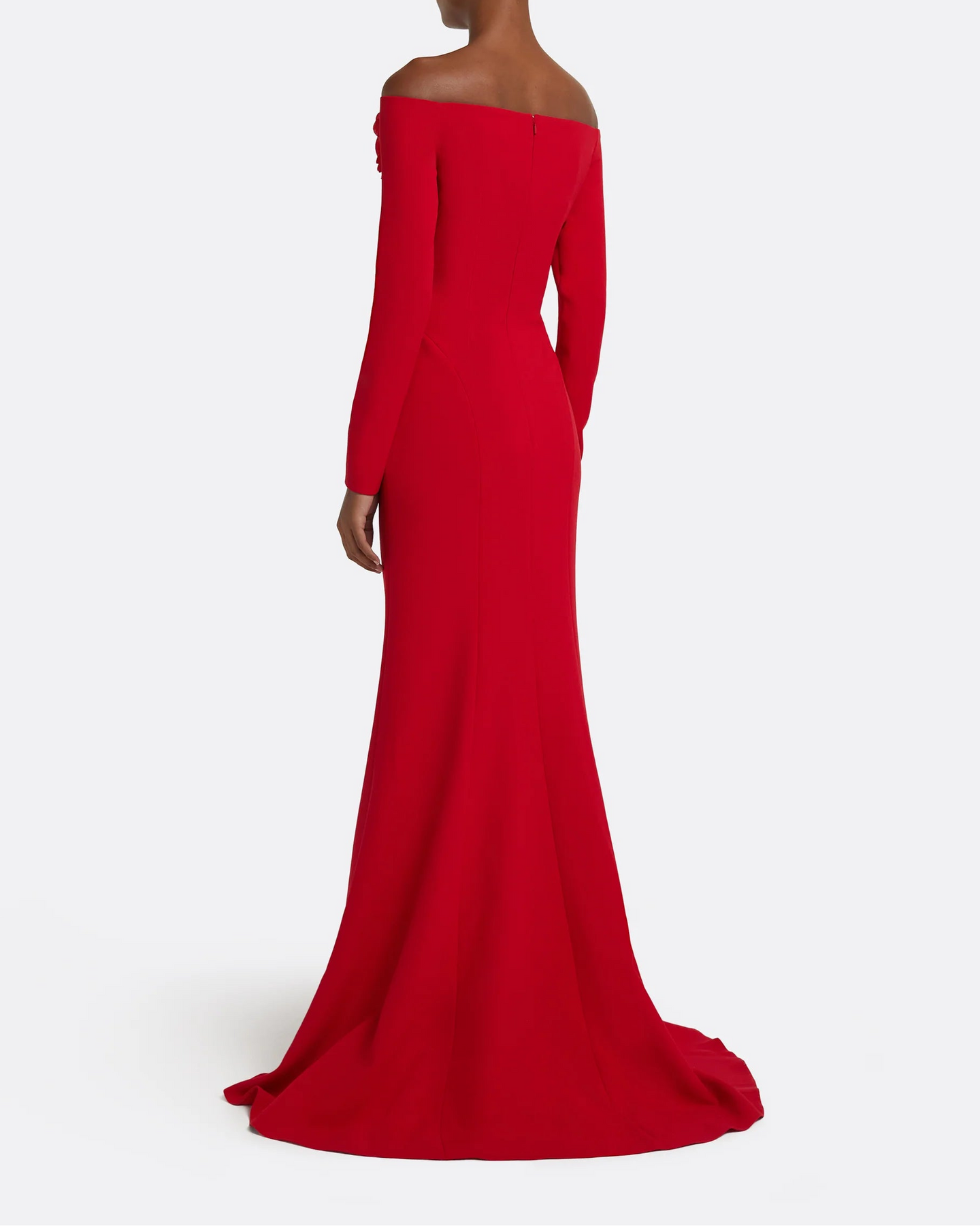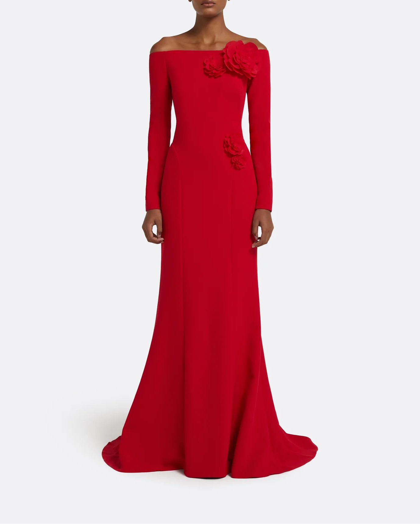 فستان حورية البحر قرمزي آسر، يتميز بفتحة رقبة أنيقة مكشوفة الكتفين، وتطريزات زهور ثلاثية الأبعاد منحوتة على طول الصدر. أنيق، أنثوي، وساحر بكل سهولة، مثالي للمناسبات المسائية المميزة.