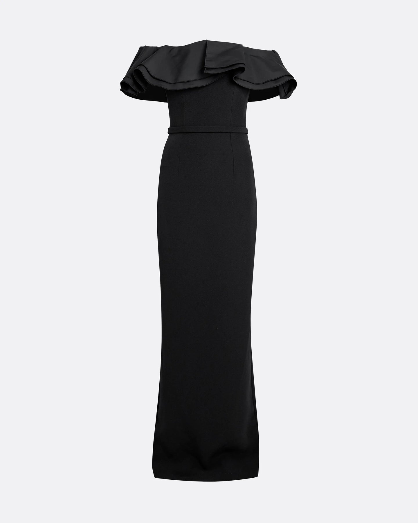 فستان سهرة أسود كلاسيكي، يتميز بفتحة صدر مكشوفة الكتفين بتصميم أنيق وعمودي. أنيق، أنثوي، وذو تصميم مثالي للمناسبات الراقية.