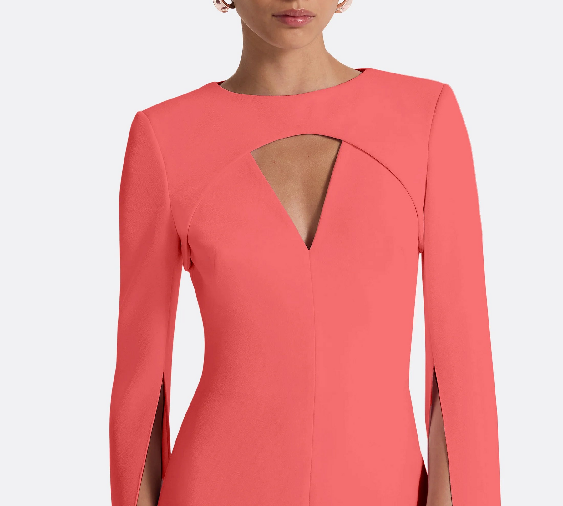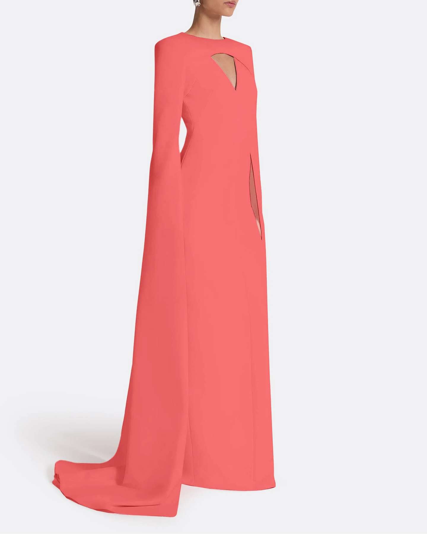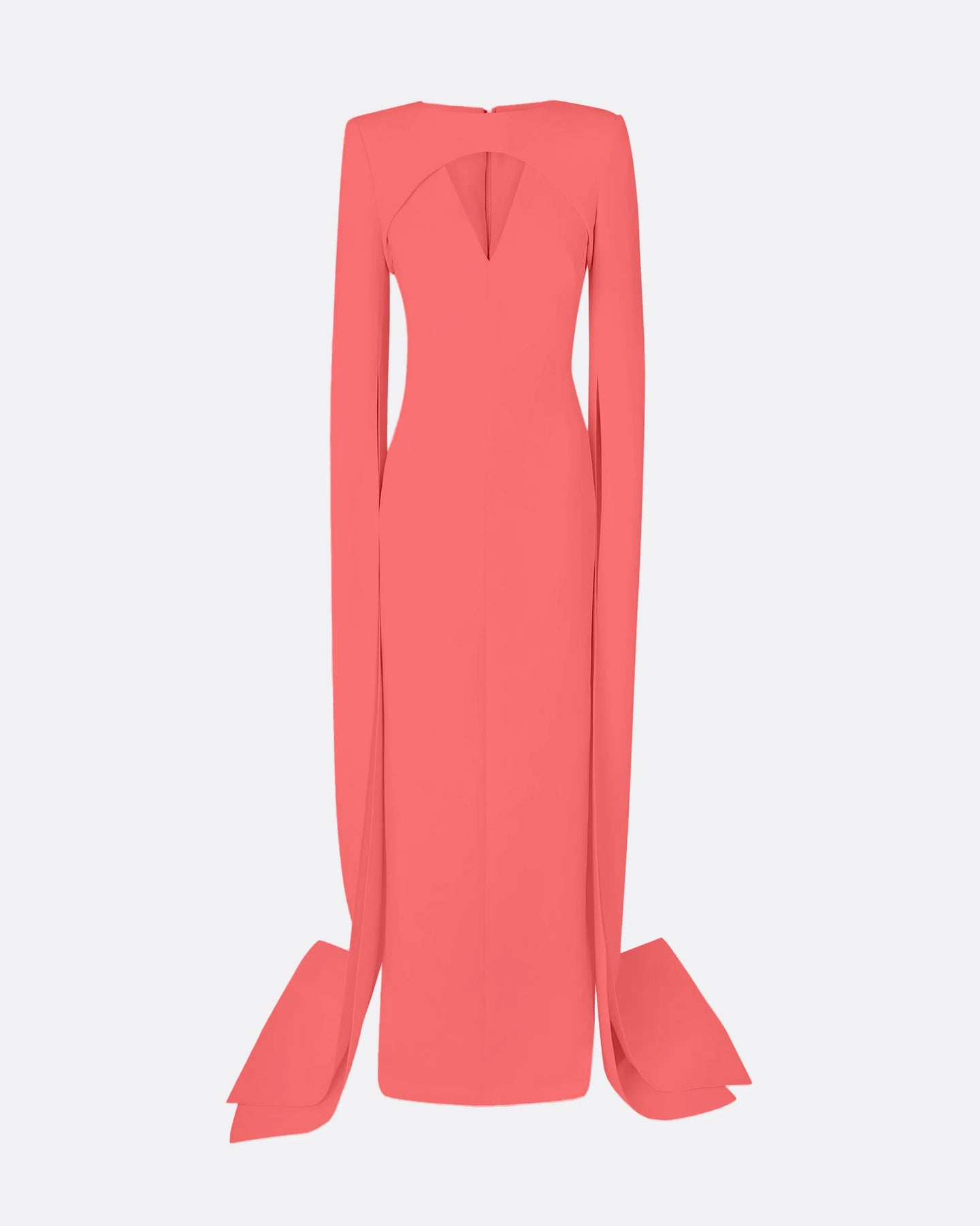 فستان سهرة مرجاني رائع بأكمام طويلة على شكل كاب وفتحة عنق أنيقة. أنيق، عصري، وساحر بكل سهولة، مثالي للمناسبات الرسمية المميزة.