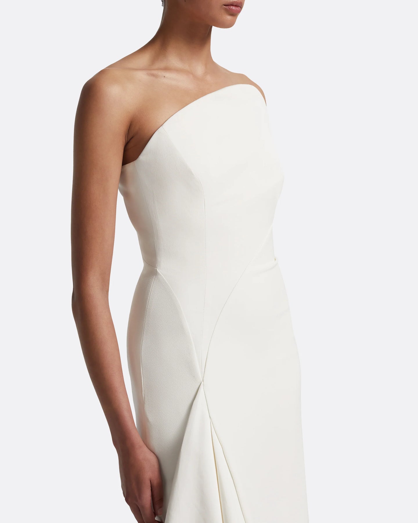 فستان عاجي أنيق يتميز بفتحة صدر أنيقة بكتف واحد وتنورة على شكل حرف A بتصميم منسدل ناعم، يضفي عليه لمسة من الحركة والأناقة العصرية. تصميم بسيط، منحوت، وراقي للغاية، مثالي لأمسيات خالدة أو مناسبات مستوحاة من حفلات الزفاف.