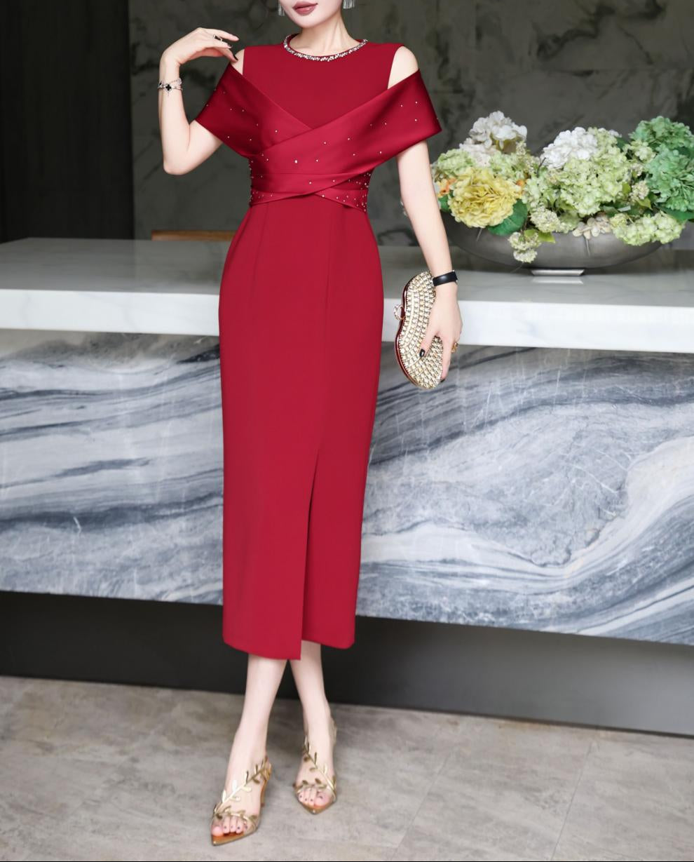 فستان عمودي أنيق بلون أحمر ياقوتي غامق، يتميز بفتحات أنيقة مكشوفة الكتفين وثنية ساتان متقاطعة مزينة ببريق رقيق. مصمم بشق أمامي أنيق لحركة أنيقة، يمزج هذا الفستان بين الرقي العصري وأناقة المساء الخالدة. القماش: بوليستر