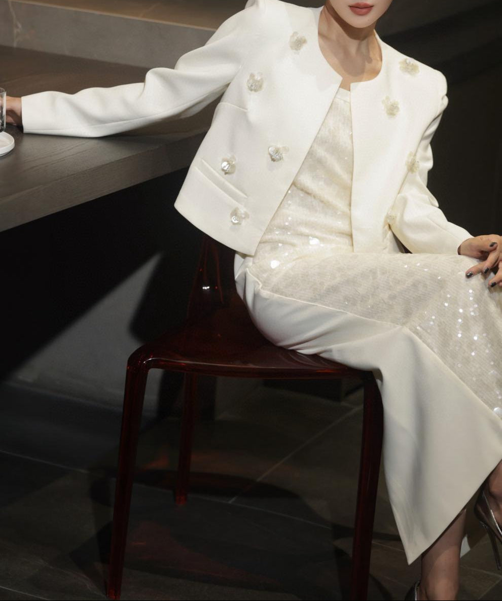 فستان عمودي أنيق مصنوع من الترتر الأبيض اللامع، ينتقيه مع سترة قصيرة أنيقة مزينة بزخارف زهرية رقيقة. طقم كلاسيكي ينبض بالأناقة والفخامة، مثالي للسهرات والمناسبات الخاصة والاحتفالات الراقية.