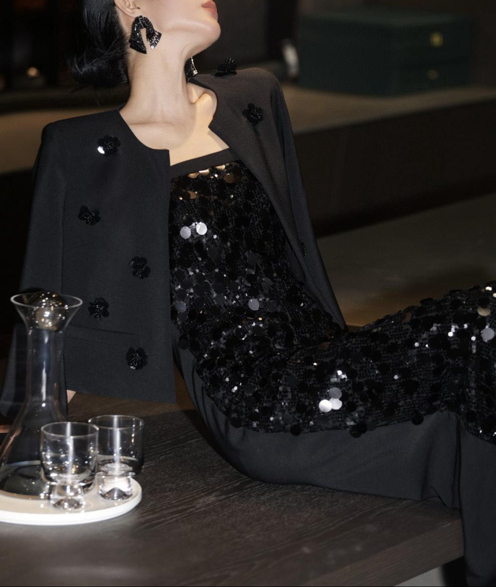 فستان عمودي بدون أكمام مزين بالترتر مع سترة قصيرة مزينة – أورورا