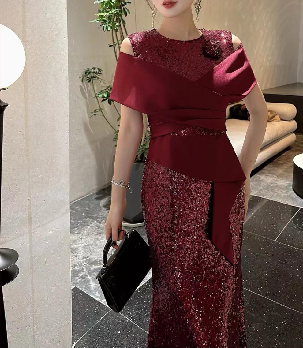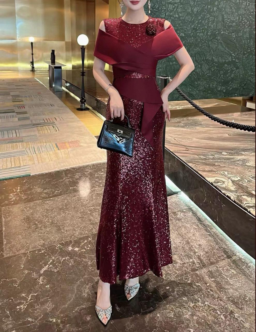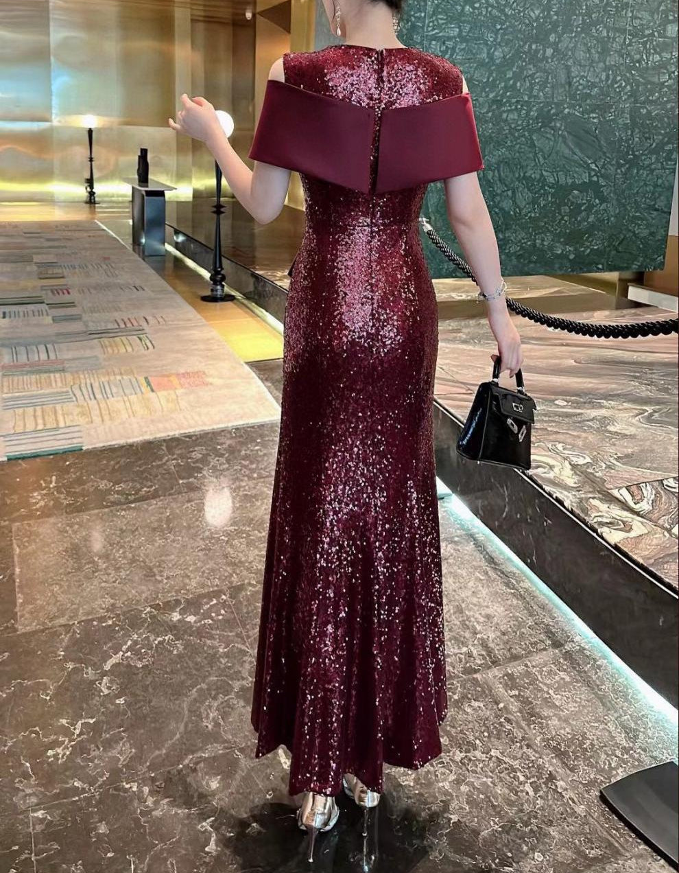 فستان حورية بحر ساحر، مصنوع من ترتر بنفسجي غامق، يتميز بصدرية ساتان منحوتة ملفوفة بشكل متقاطع، مما يضفي بُعدًا وأناقة على التصميم. يتميز بفتحات كتف أنيقة وحاشية ناعمة وفضفاضة، مما يجعله مثاليًا لحفلات المساء وحفلات الزفاف والاحتفالات الفاخرة.