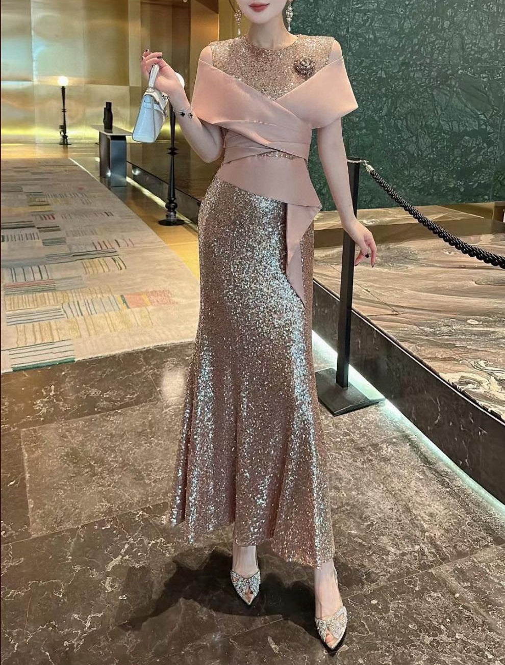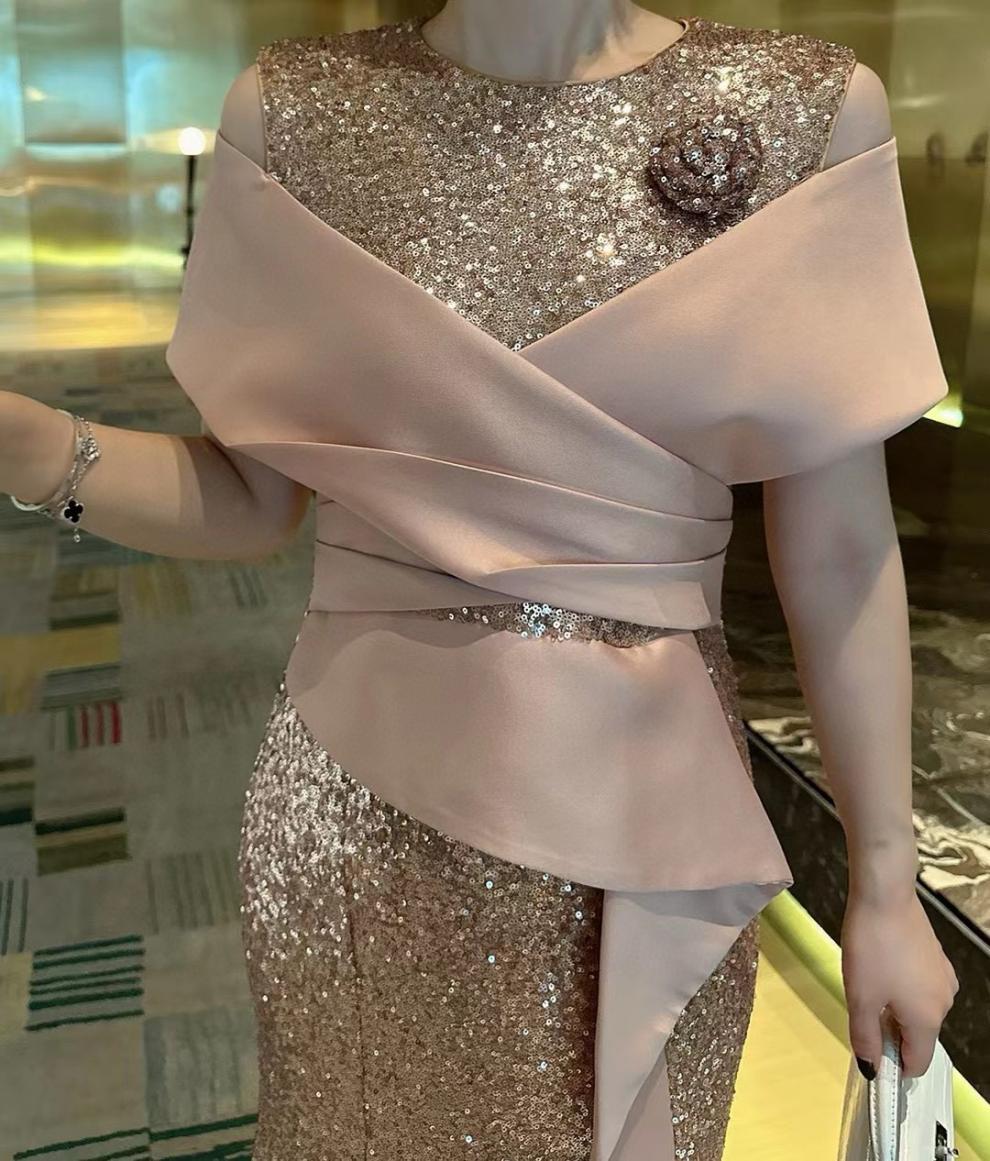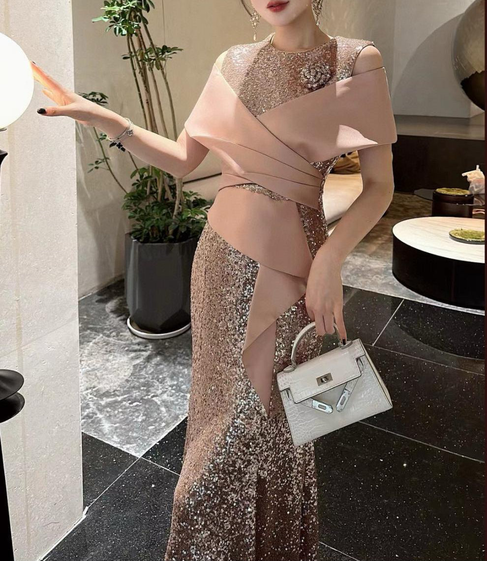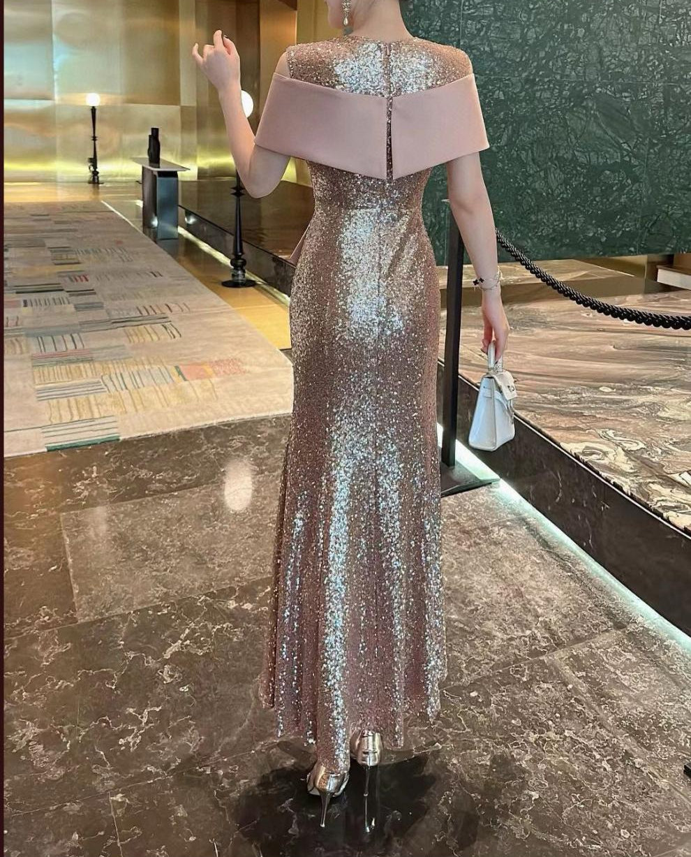 فستان حورية بحر ساحر، مصنوع من ترتر بنفسجي غامق، يتميز بصدرية ساتان منحوتة ملفوفة بشكل متقاطع، مما يضفي بُعدًا وأناقة على التصميم. يتميز بفتحات كتف أنيقة وحاشية ناعمة وفضفاضة، مما يجعله مثاليًا لحفلات المساء وحفلات الزفاف والاحتفالات الفاخرة.
