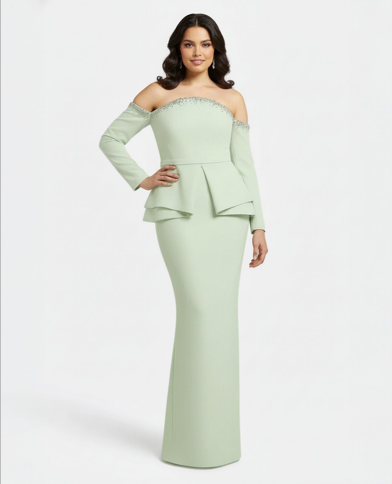 فستان أنيق وأنثوي بلون أخضر نعناعي ناعم، مكشوف الكتفين، بأكمام طويلة، وياقة مطرزة بخرز رقيق، وقصة ببلوم منحوتة متعددة الطبقات. تصميمه المفصّل ينضح بأناقة عصرية مع لمسة رومانسية.