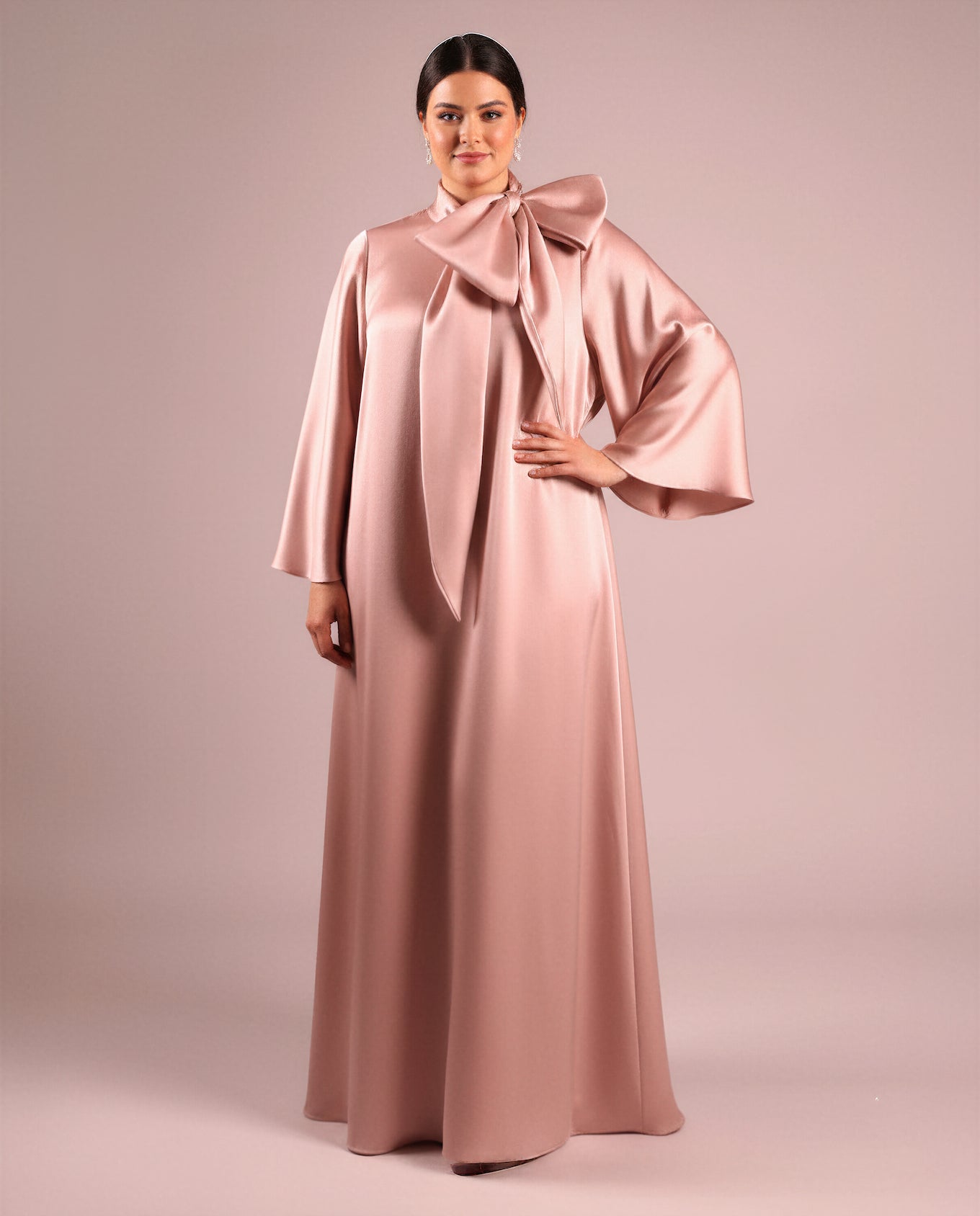 فستان ساتان ورديّ ورديّ بسيط وجذاب، يتميز بياقة عالية مزينة بفيونكة منحوتة كبيرة. يتميّز هذا الفستان بتصميمه الفضفاض الطويل وأكمامه الطويلة الأنيقة ولمعانه الناعم، ما يجعله مثاليًا للمناسبات الرسمية، والسهرات الأنيقة، أو إطلالات الموضة العصرية المحتشمة.
