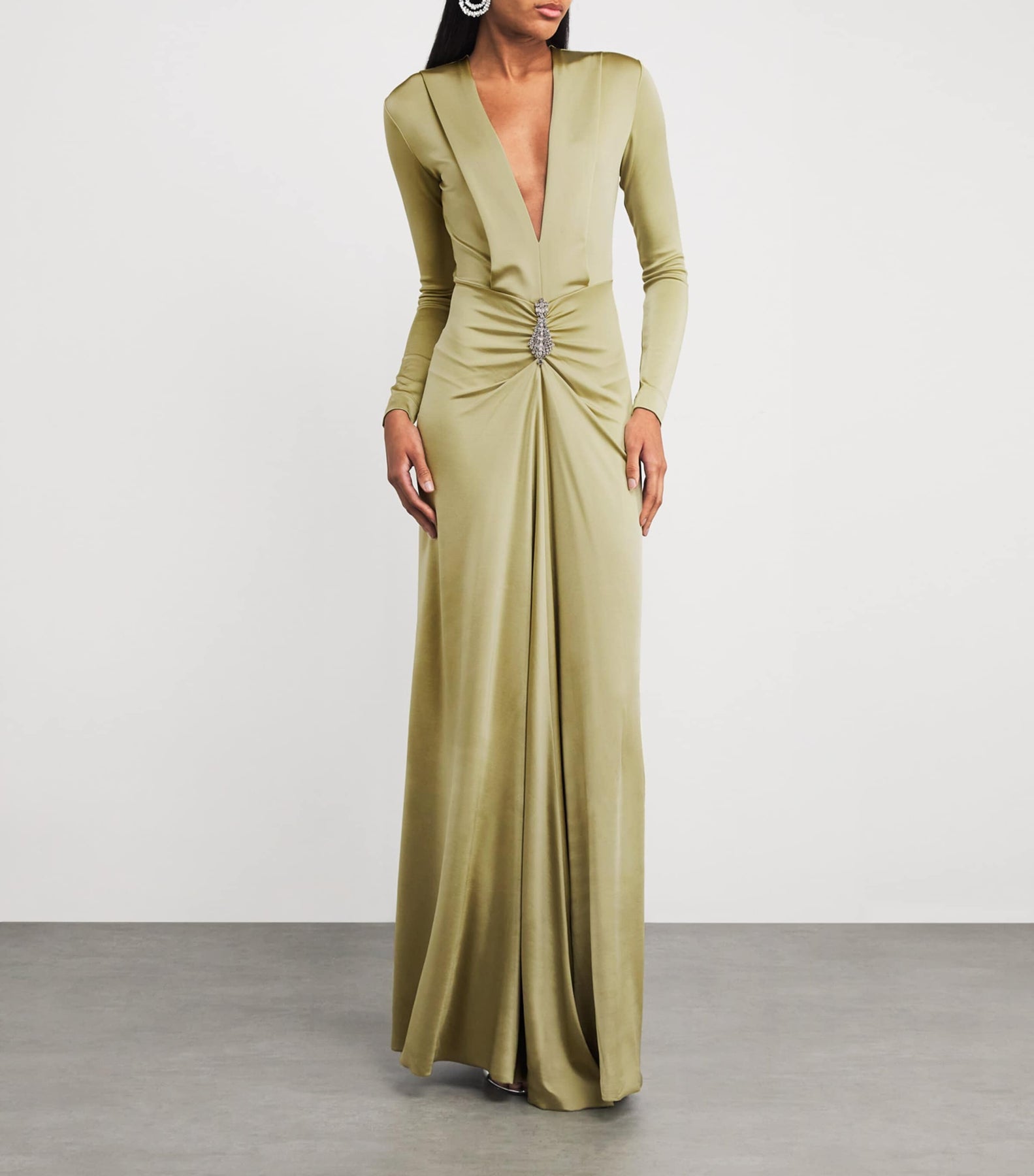 فستان أنيق بلون زيتوني، يتميز بفتحة رقبة عميقة على شكل حرف V، وتطريز أمامي أنيق، مزين بدبوس كريستالي. أكمامه الطويلة وتصميمه الانسيابي يمزجان بين الجاذبية والأناقة الراقية.