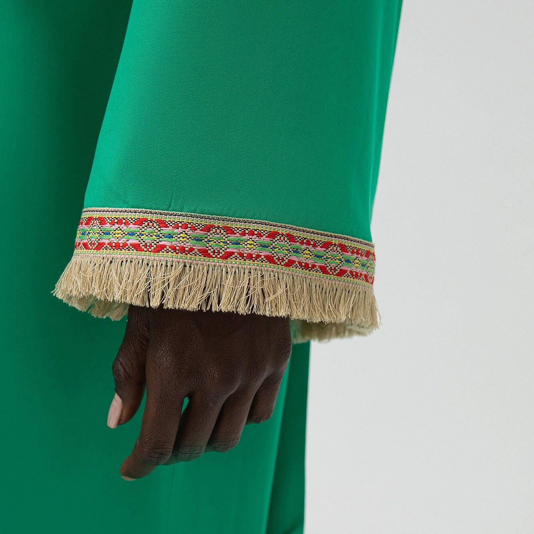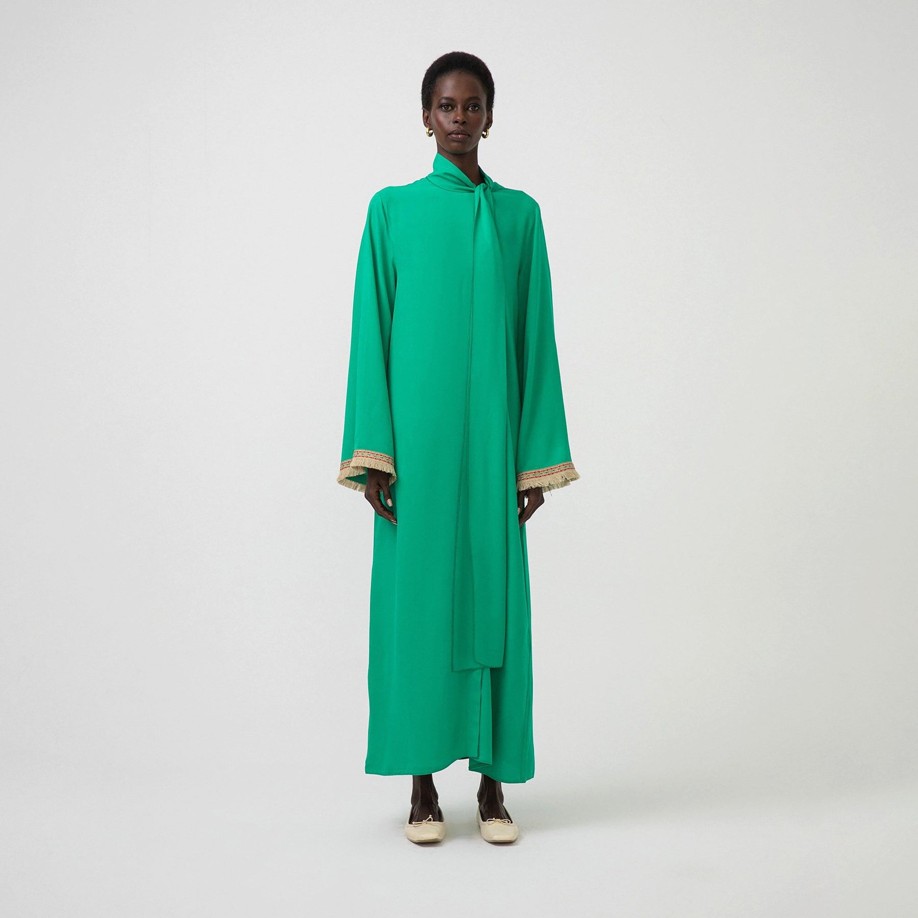 قفطان أخضر زمردي انسيابي بأكمام واسعة مزينة بزخارف ذهبية دقيقة وربطة عنق ناعمة. قطعة راقية تجمع بين البساطة العصرية والأناقة الملكية.