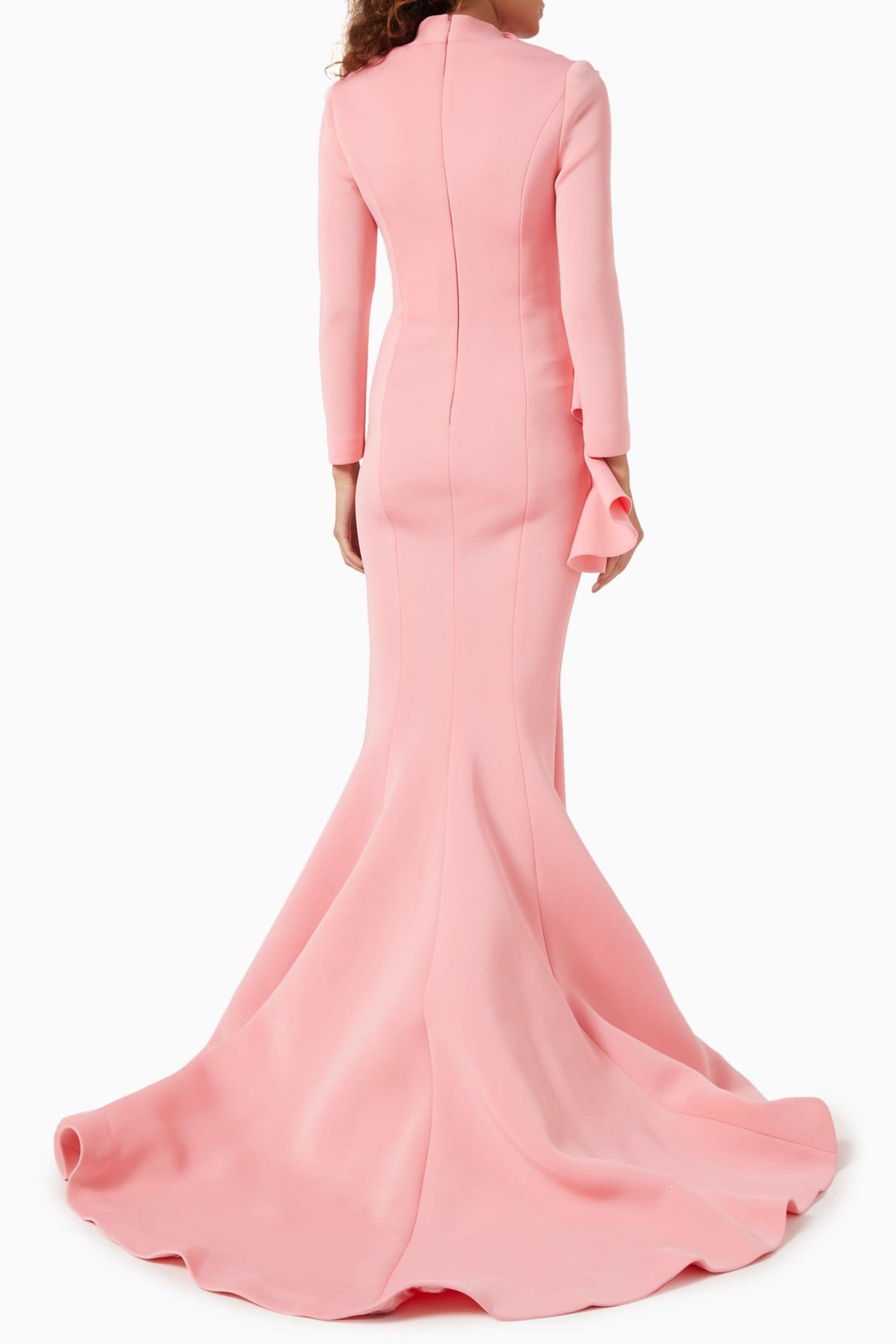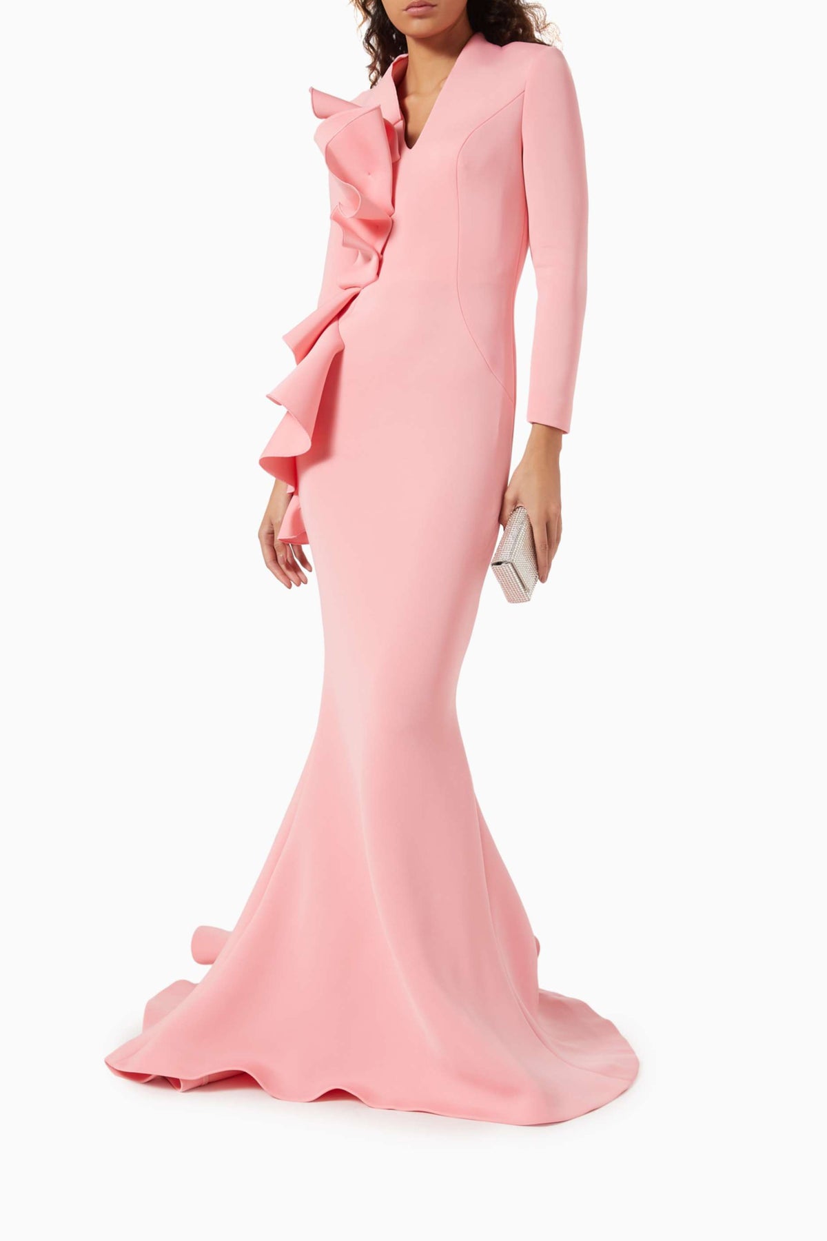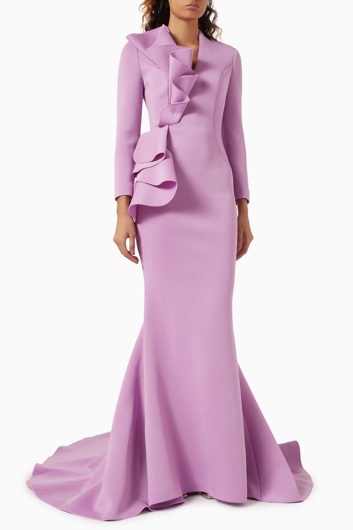 فستان أرجواني أنيق يتميز بكشكشة منسقة على طول المقدمة وقصة حورية البحر الأنيقة. يجمع التصميم المنحوت وذيل الفستان الانسيابي بين الأناقة المعمارية والسحر الأنثوي الناعم.