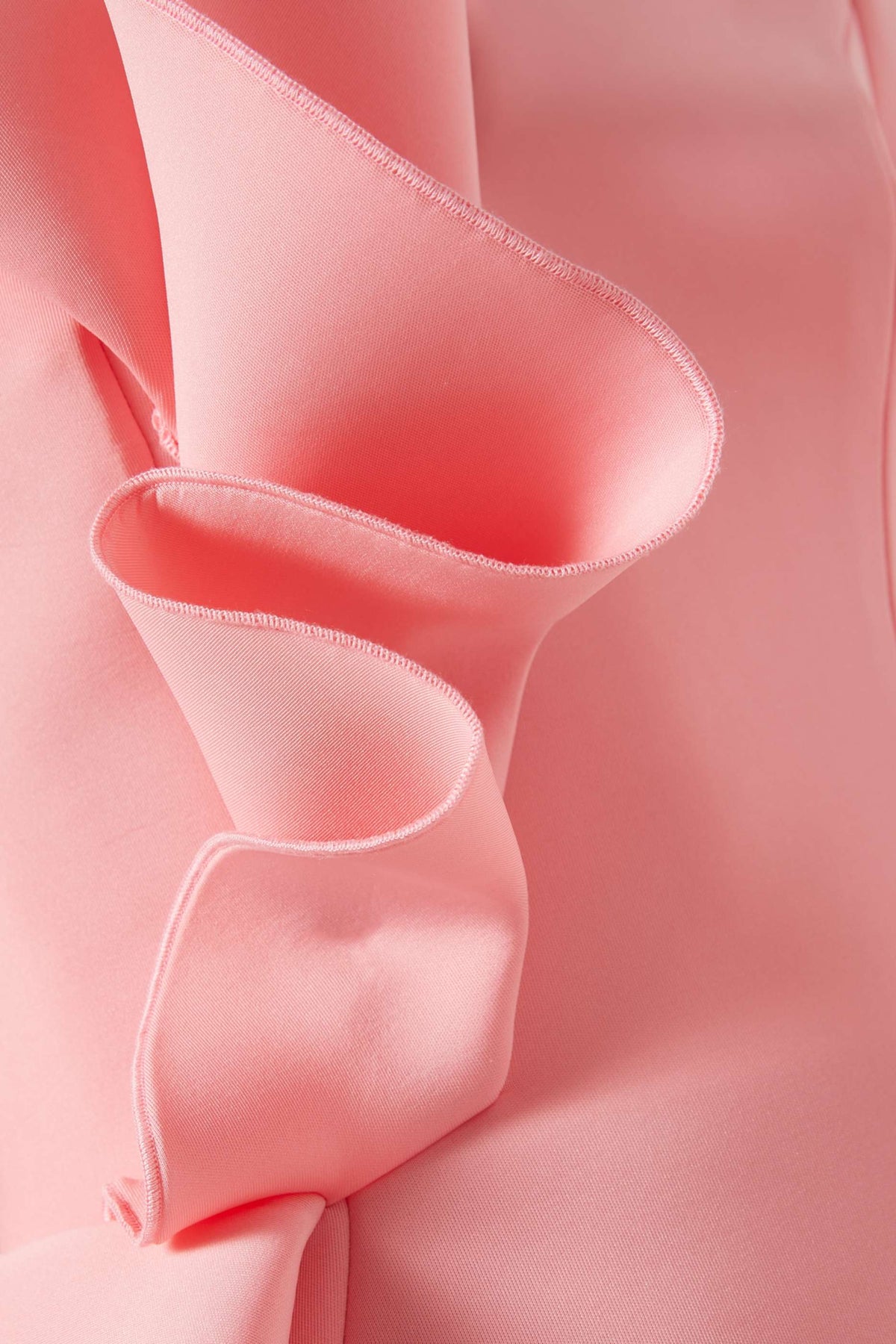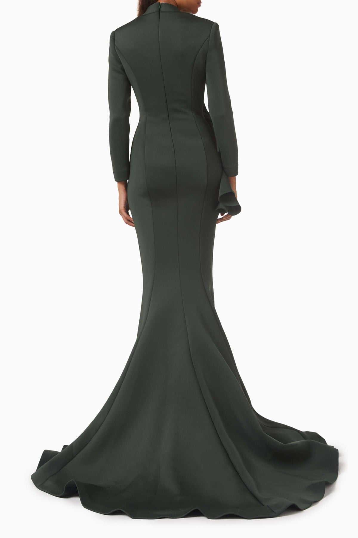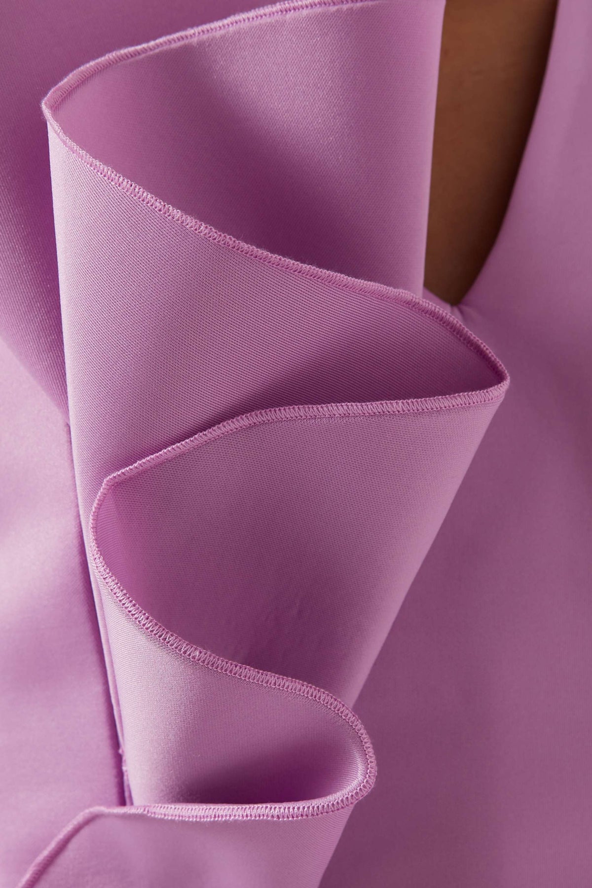 فستان أرجواني أنيق يتميز بكشكشة منسقة على طول المقدمة وقصة حورية البحر الأنيقة. يجمع التصميم المنحوت وذيل الفستان الانسيابي بين الأناقة المعمارية والسحر الأنثوي الناعم.