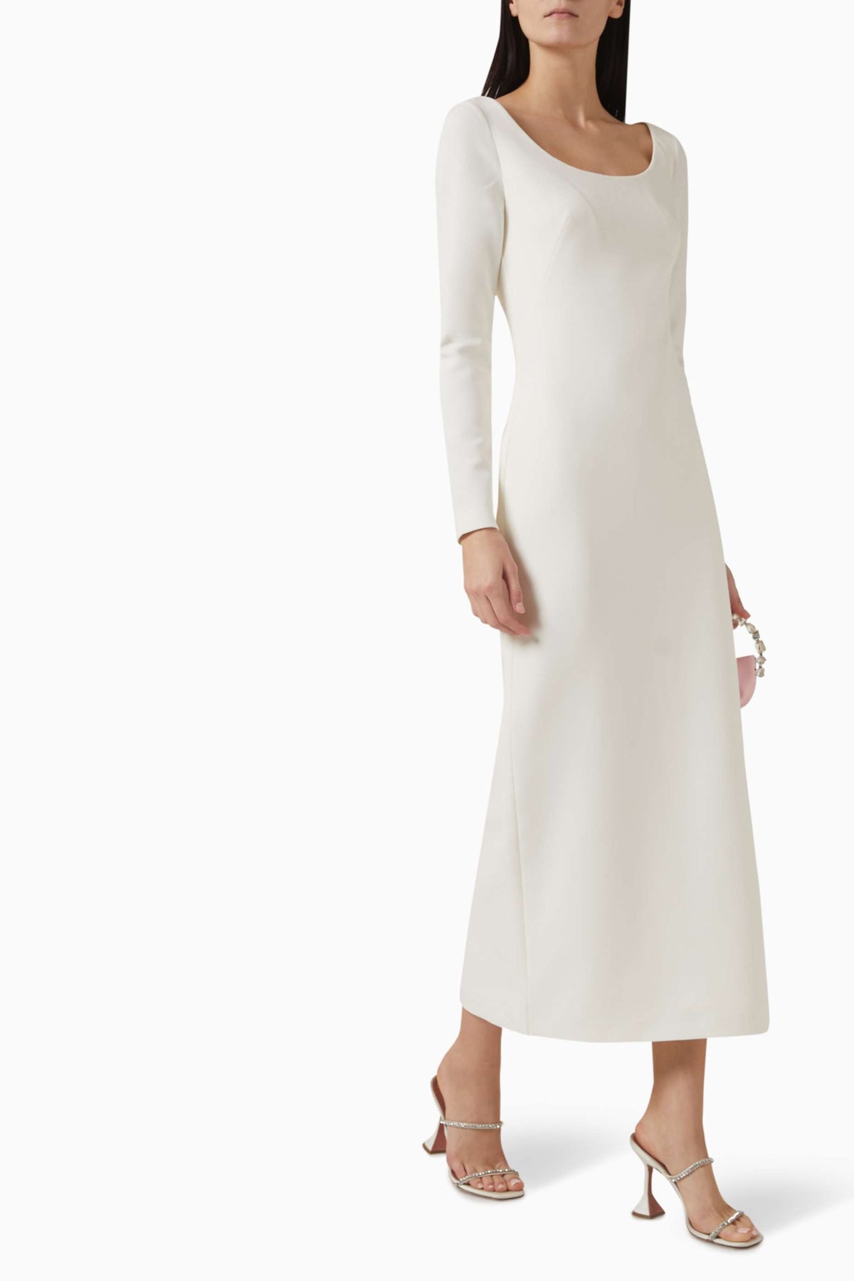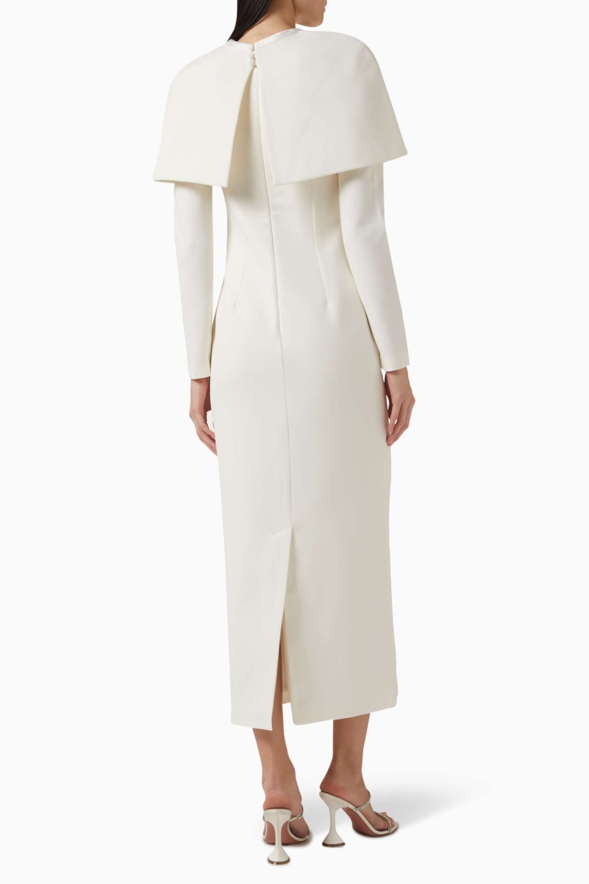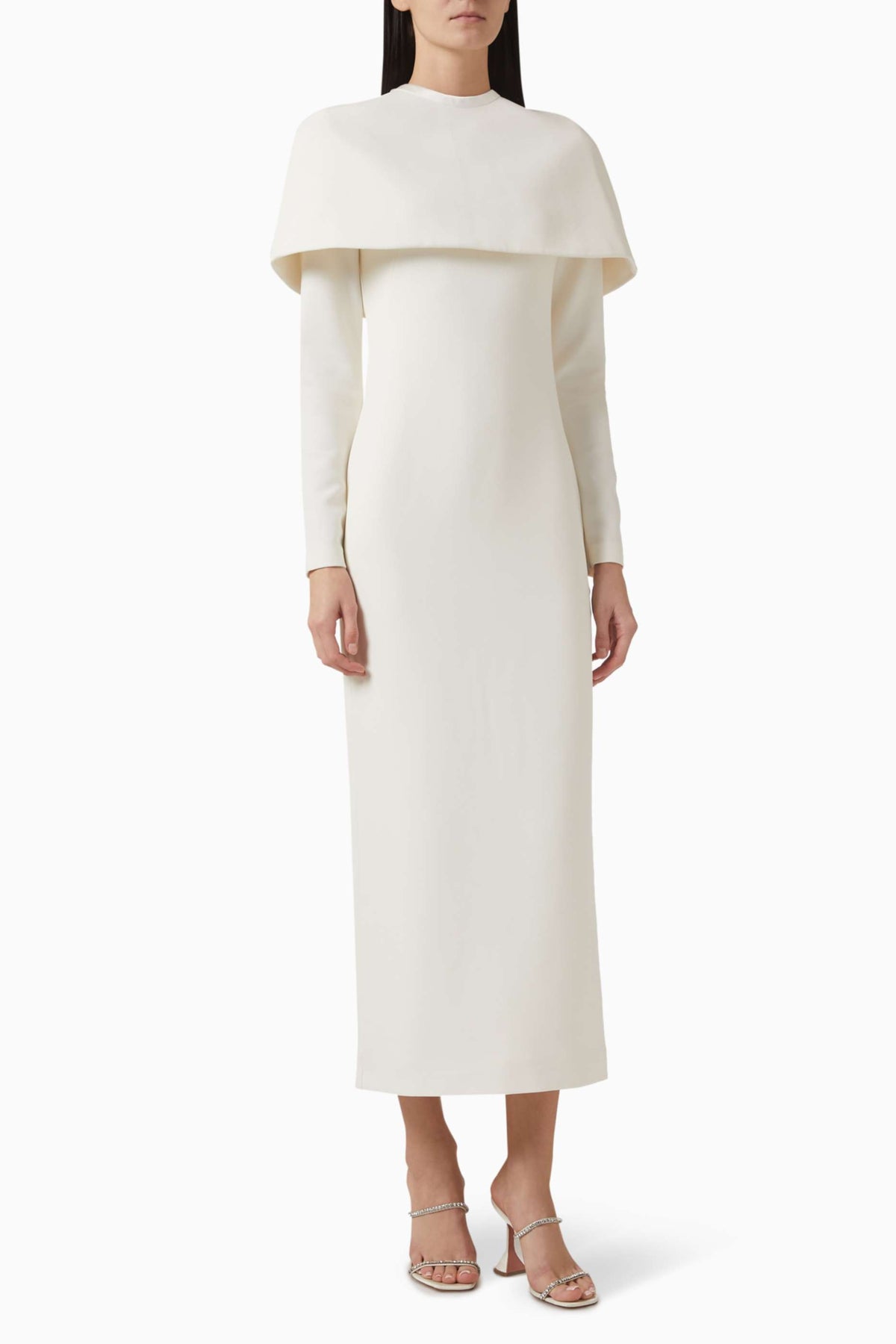 فستان عاجي عمودي يتميز بتصميمه البسيط وغطاء الرأس المنحوت. صُمم هذا الفستان ليمنحكِ لمسةً من الرقي، ويمزج بين الفن الحديث والأناقة الخالدة - خيار مثالي للأمسيات الأنيقة أو مناسبات الزفاف العصرية.