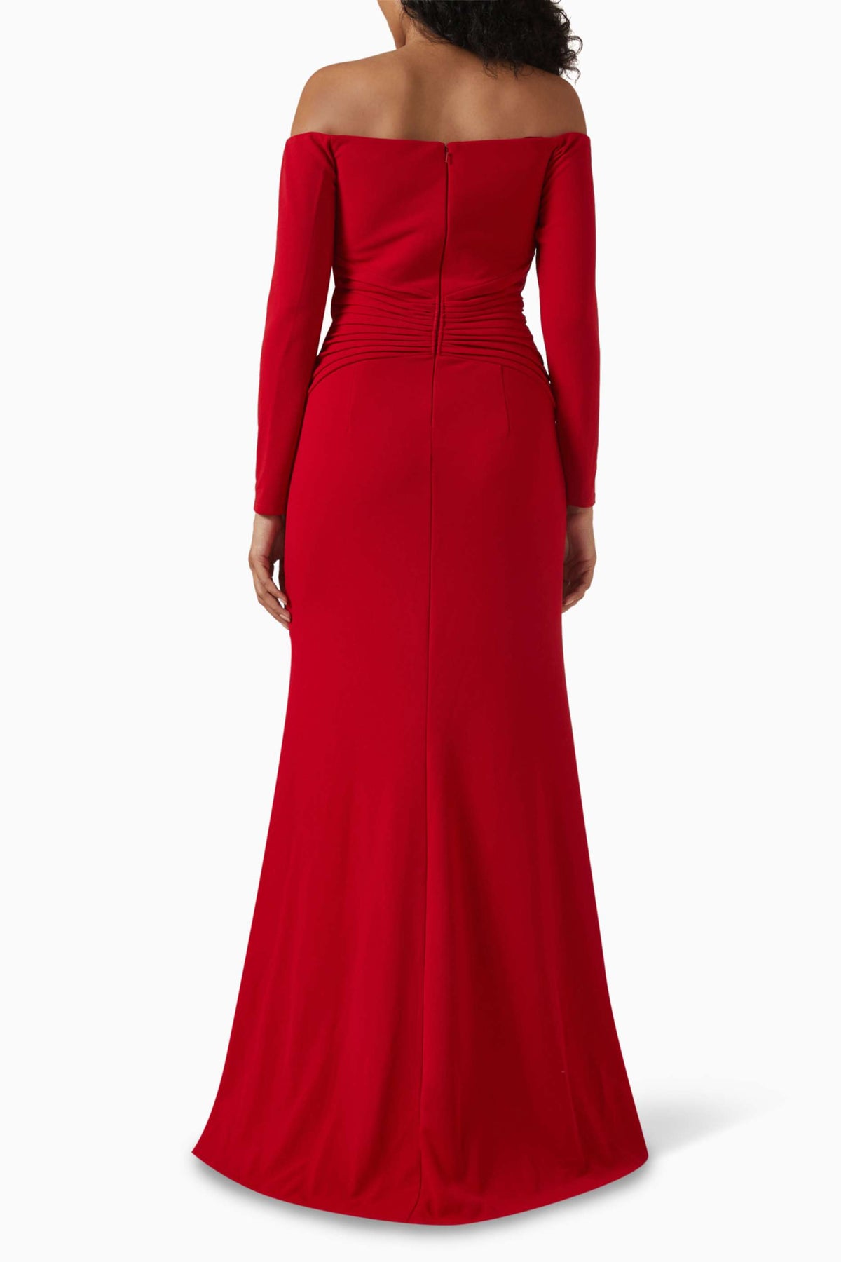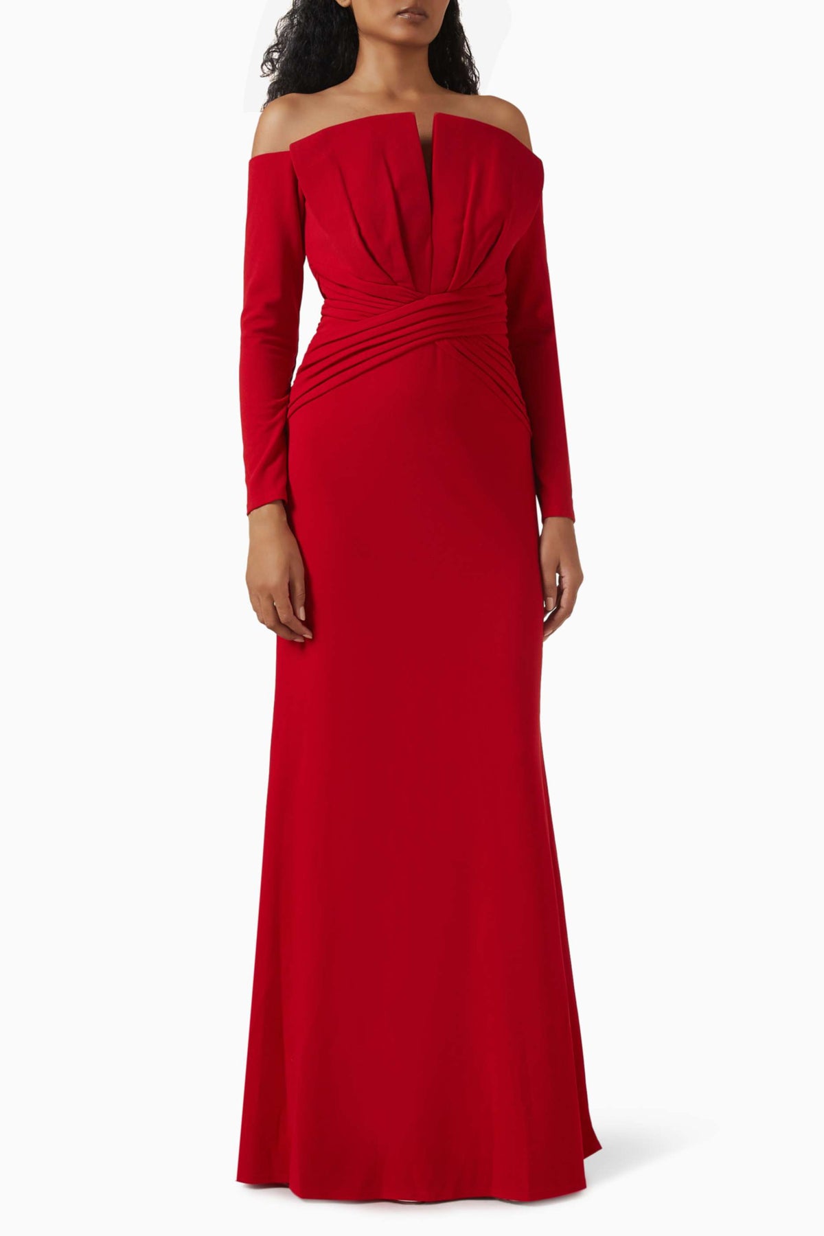 فستان قرمزي رائع يتميز بفتحة صدر مكشوفة الكتفين مع طيات أنيقة، وخصر منسدل، وتصميم حورية البحر الأنيق. مصمم ليُبرز جمال قوامك ويمنحكِ إطلالة لا تُنسى في المناسبات المسائية.