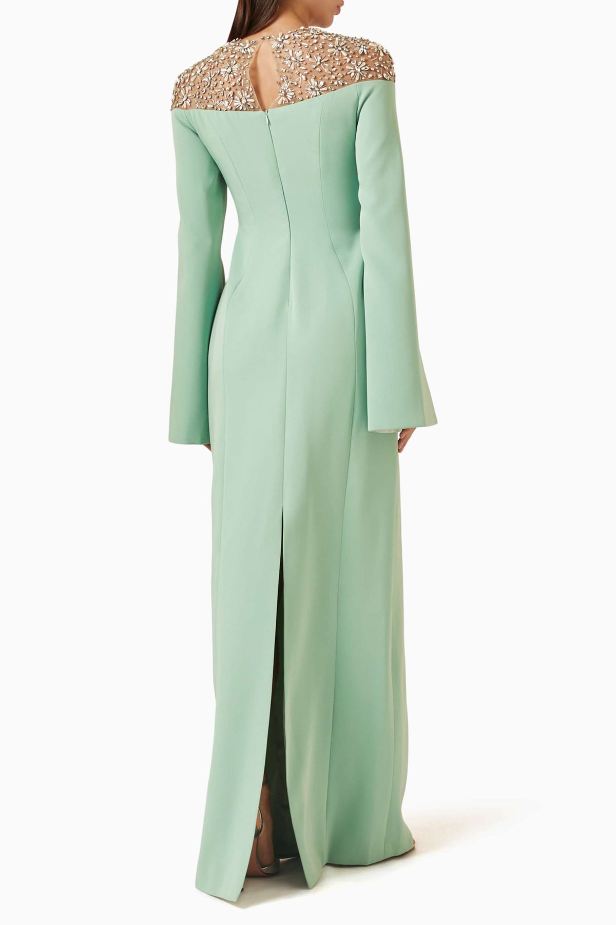 فستان أنيق بلون أخضر نعناعي، بتصميم عمودي، مزين بياقة مطرزة بالكريستال وأكمام أنيقة على شكل كاب. يجمع بين الأناقة والرقي العصري، ما يجعله القطعة المثالية لحفلات الزفاف والمناسبات المسائية.
