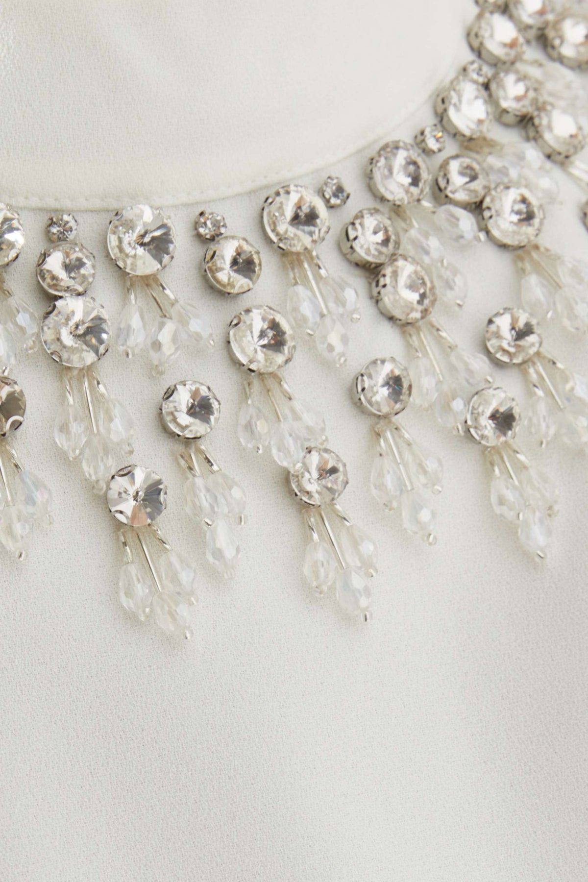 فستان عاجي أنيق بقصة A، يتميز بياقة عالية مزينة بكريستالات لامعة. بأكمامه الطويلة وقصته الأنيقة، يتألق هذا التصميم بأناقة، مثالي للأمسيات الراقية والاحتفالات الرسمية.