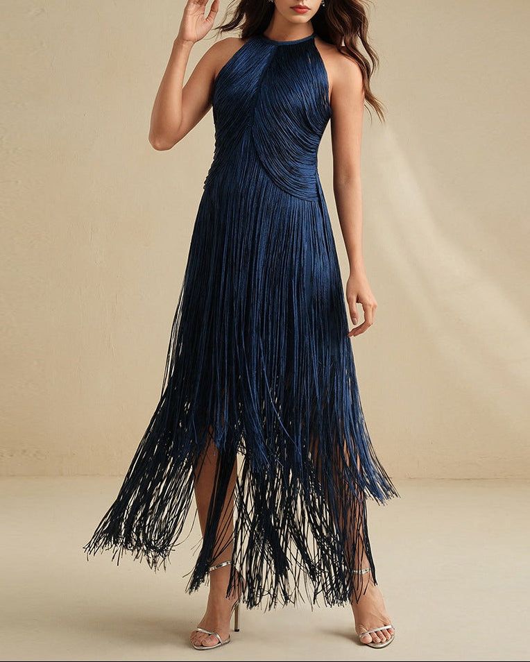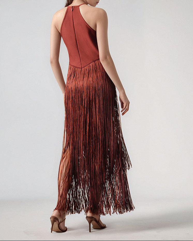 فستان برونزي أنيق بدون أكمام، يتميز بنسيج معدني مطوي وتفاصيل شراشيب متدفقة لحركة انسيابية. مصمم بقصة ضيقة وشق أمامي، ينضح هذا الفستان بأناقة أنيقة وجاذبية تُناسب إطلالات السجادة الحمراء.