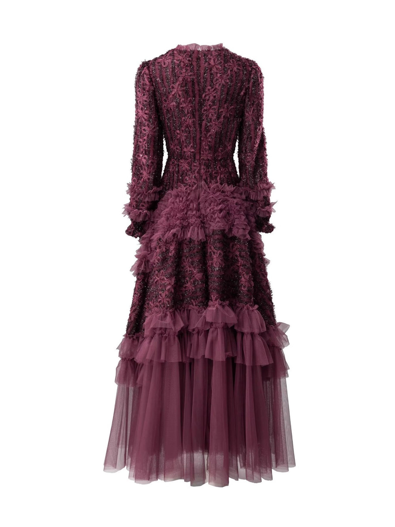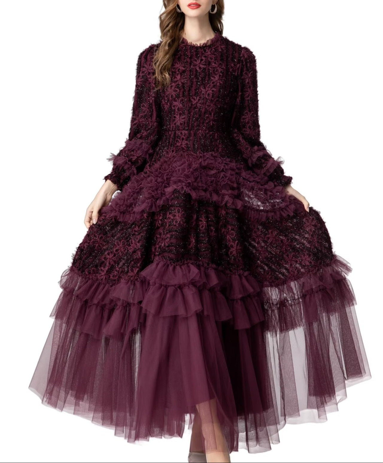 فستان أمارانث فاخر وعميق، مزين بدانتيل زهري متقن وطبقات من الكشكشة الضخمة من التول. مصمم بأكمام طويلة وصدرية ضيقة تنساب إلى تنورة متعددة الطبقات، ليجسد الأناقة والرقي الرومانسي، مثالي لحفلات المساء والمناسبات الخاصة.