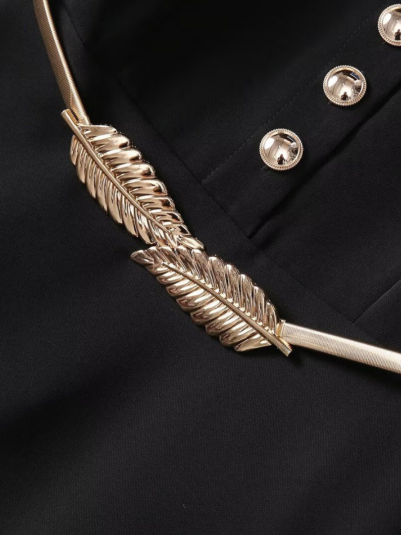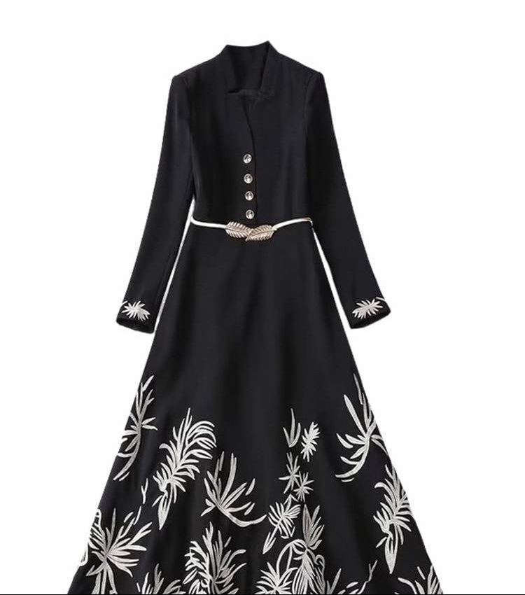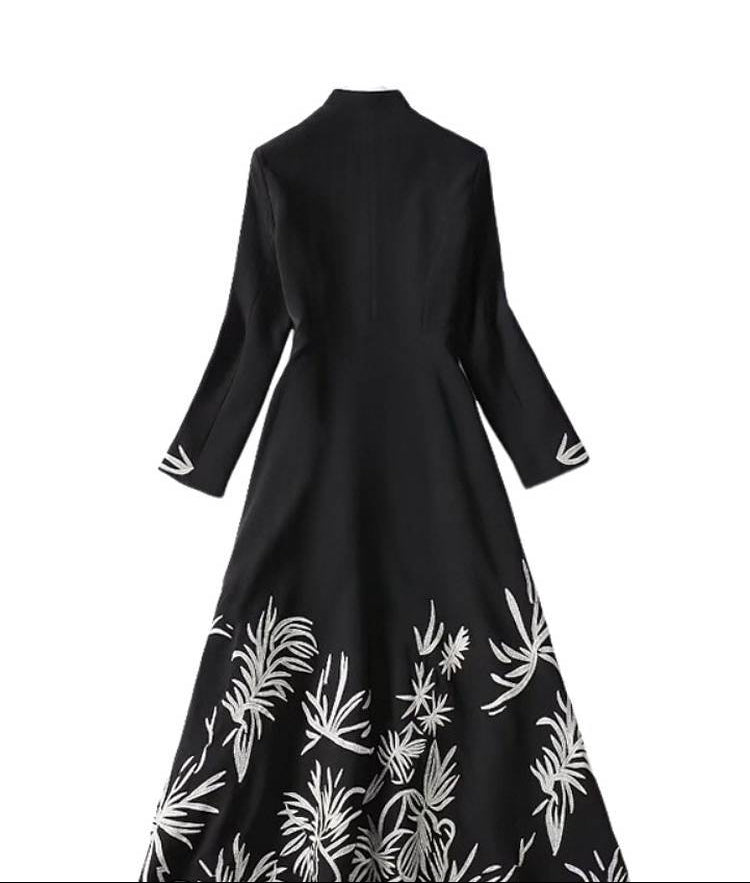 فستان ماكسي أسود أنيق، مزين بتطريز ذهبي على طول الحافة والأكمام. مصمم بقصة مُحكمة، وياقة بأزرار، وحزام خصر رفيع، يجمع بين الرقي والسحر العصري، مثالي للمناسبات المسائية واللقاءات الرسمية.