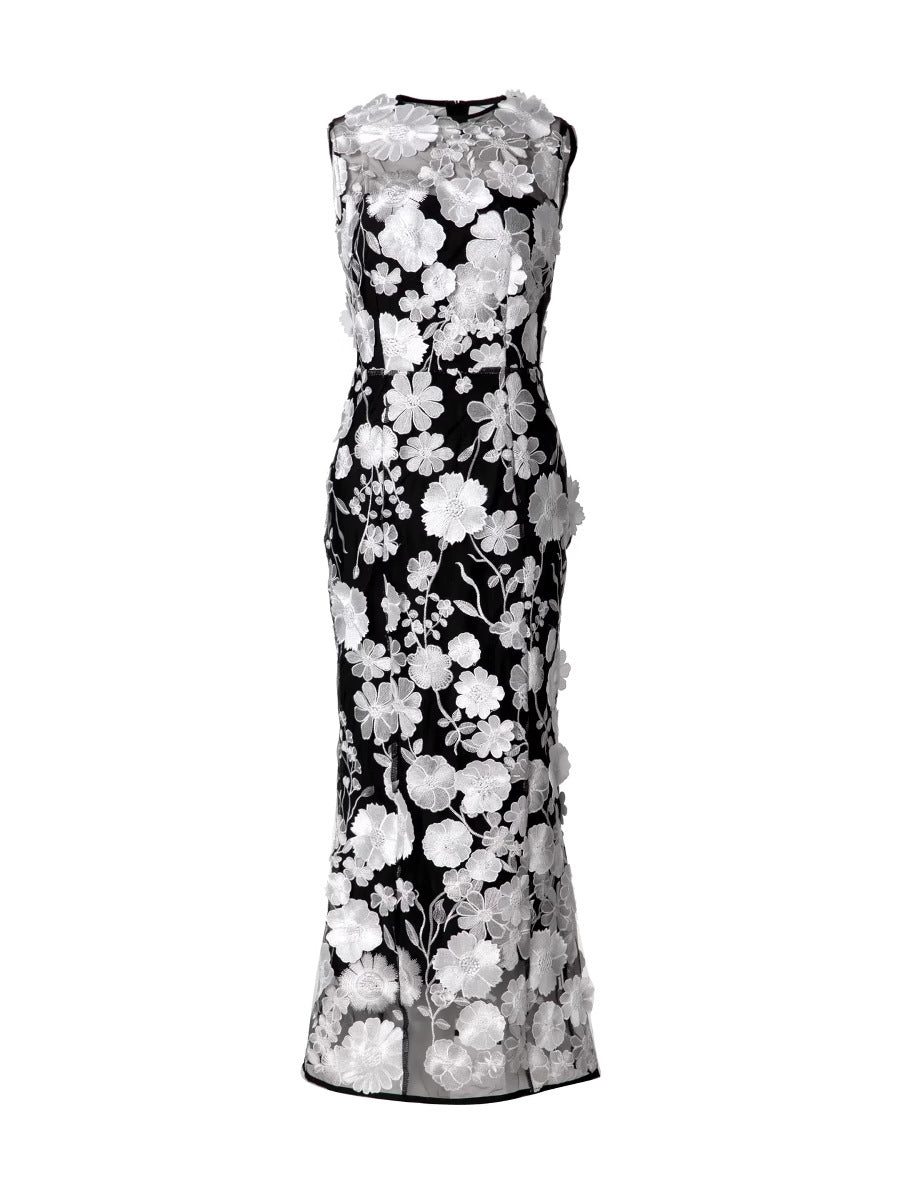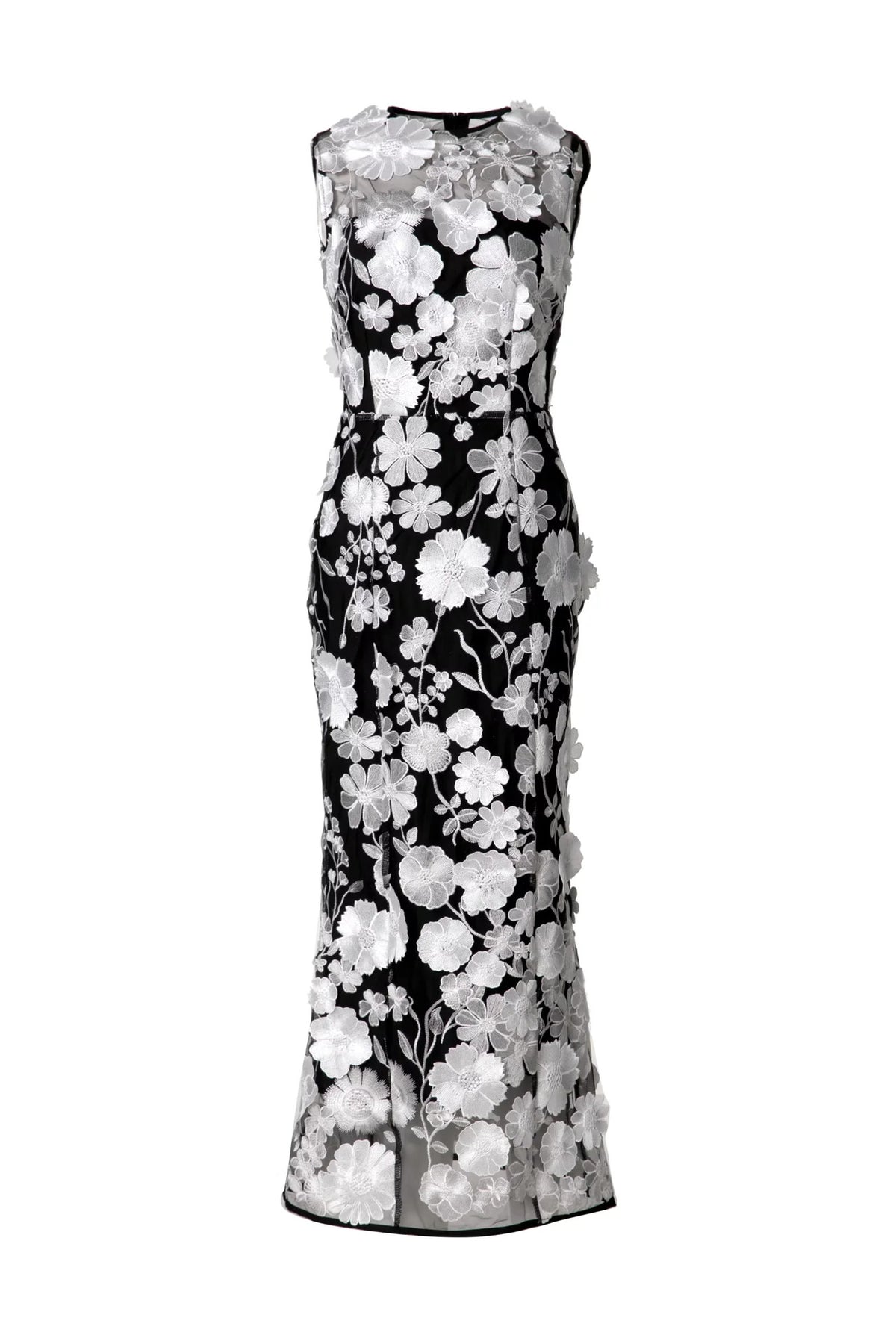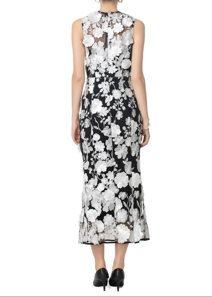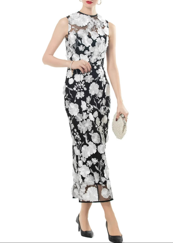 فستان أنيق بدون أكمام، بقاعدة سوداء مزينة بتطريز زهور بيضاء متقن. تصميمه الملائم وطوله الذي يصل إلى الأرض ينضحان بأناقة خالدة، مثالي لحفلات المساء والاحتفالات الراقية.