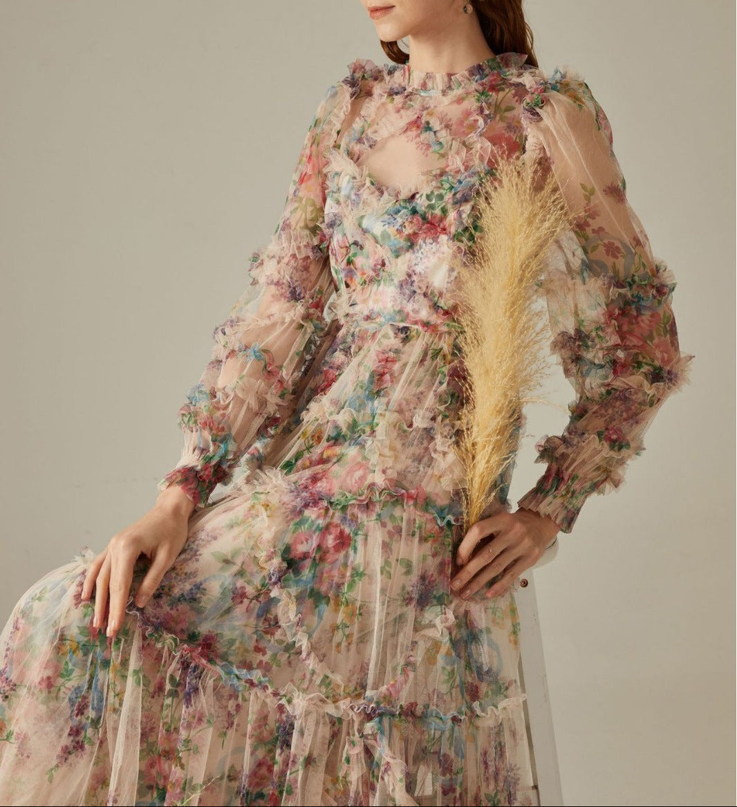 فستان طويل رومانسي مصنوع من التول الأسود الشفاف، مزين بتطريز زهري نابض بالحياة. يتميز بطبقات من الكشكشة، وأكمام طويلة منفوخة، وخصر ضيق ينساب بسلاسة ليمنحكِ قوامًا رقيقًا. مثالي للمناسبات المسائية والإطلالات المستوحاة من عالم الأزياء الراقية.