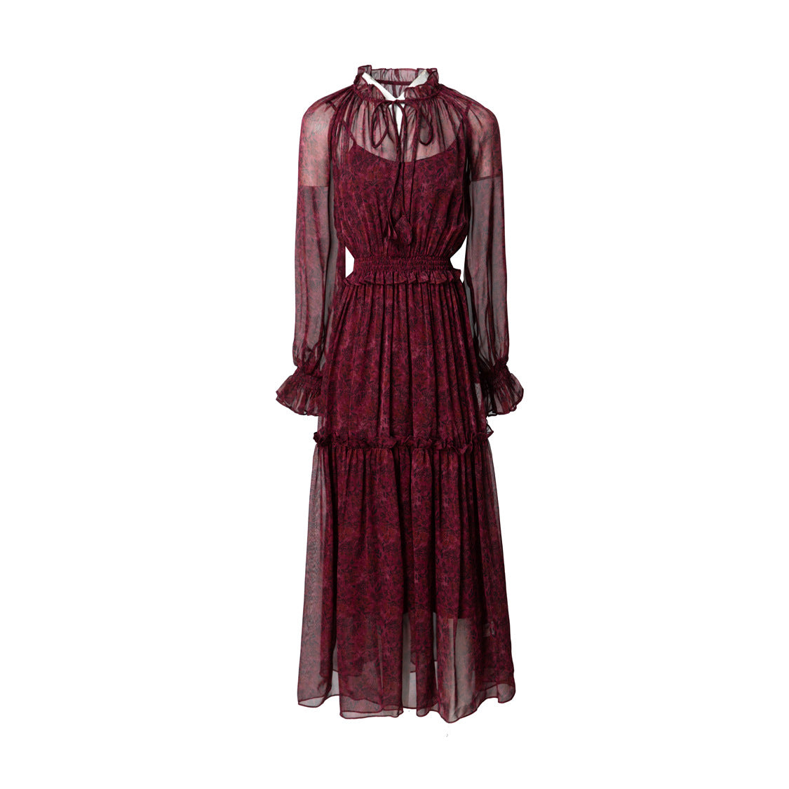 فستان شيفون رومانسي بلون عنابي، بأكمام طويلة شفافة، وتنورة متدرجة، وتفاصيل رباط عنق أنيقة. خصره المشدود وقصته الانسيابية تضفيان عليه سحرًا أنيقًا مستوحى من الطراز القديم، مثالي للسهرات والتجمعات المسائية.