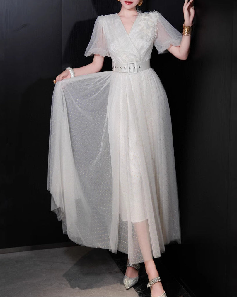 فستان تول عاجي فاتح، يتميز بصدرية ملفوفة ناعمة، وأكمام شفافة منفوشة، وتنورة واسعة متعددة الطبقات. مزين بحزام عريض بلون موحد لخصر مشدود وقوام حالم، مثالي للسهرات الأنيقة أو الاحتفالات الرومانسية.