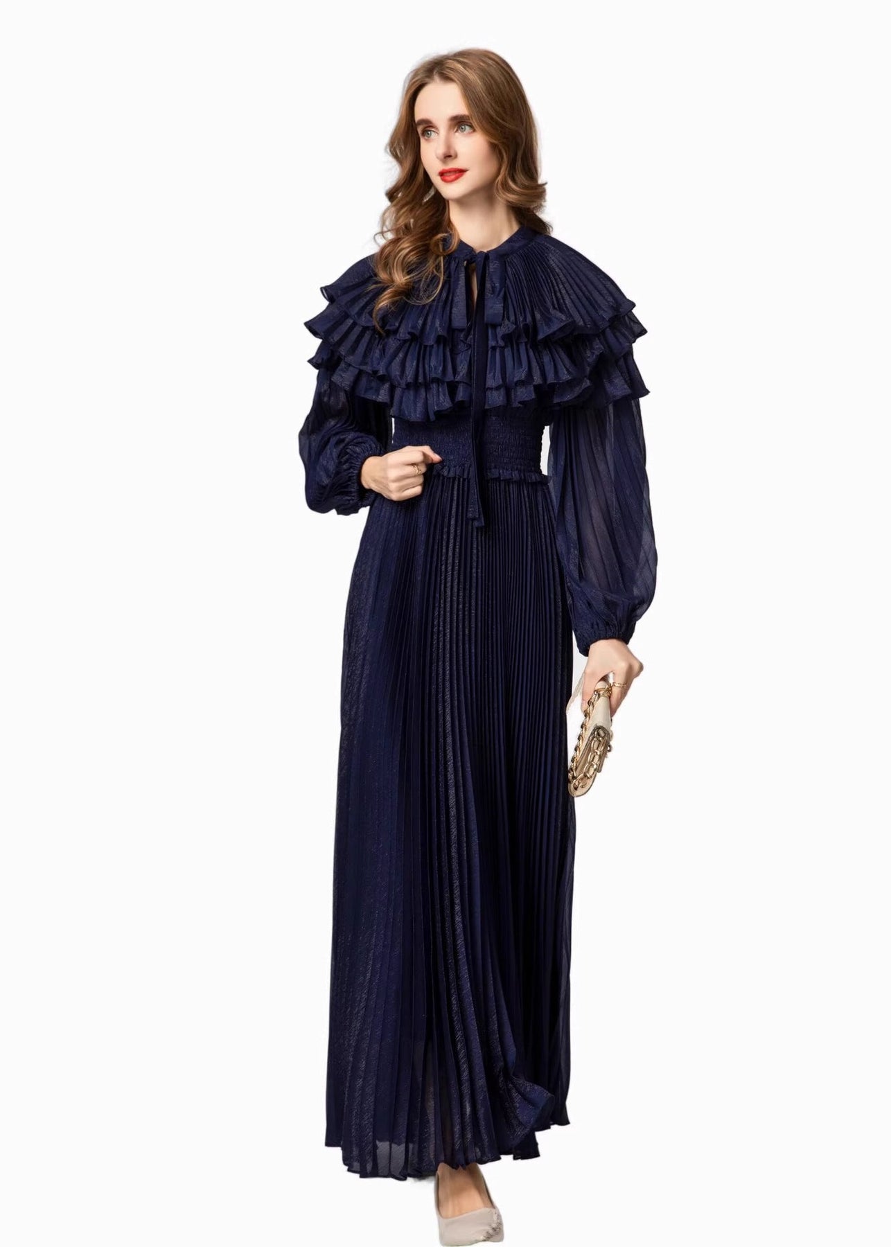 فستان شيفون كحلي أنيق، يتميز بياقة مكشكشة متعددة الطبقات، وأكمام واسعة، وتنورة طويلة بثنيات أنيقة. يُضفي الخصر المزركش لمسةً من الأناقة على تصميمه الانسيابي، مثالي للأمسيات الأنيقة أو التجمعات الراقية.