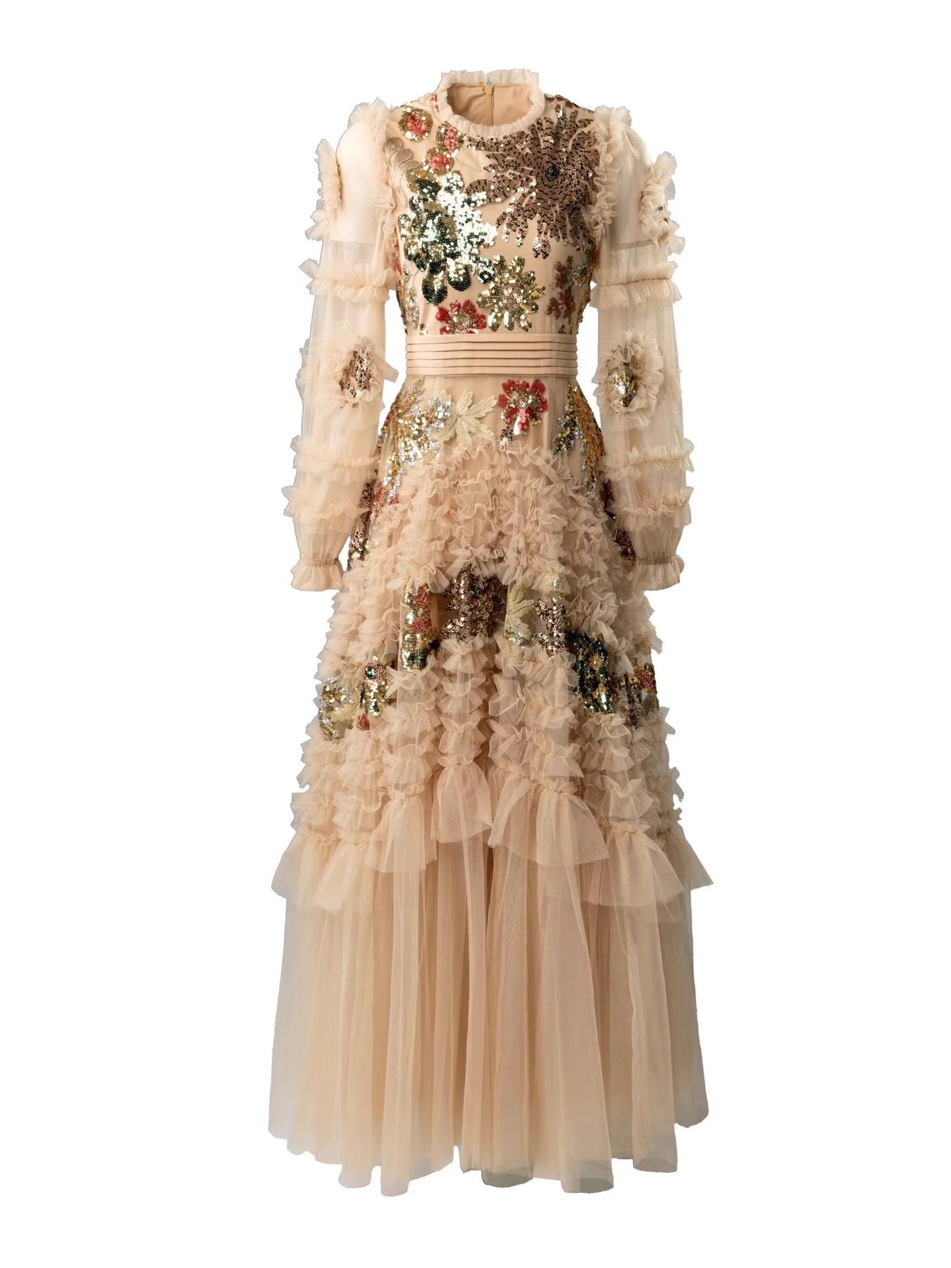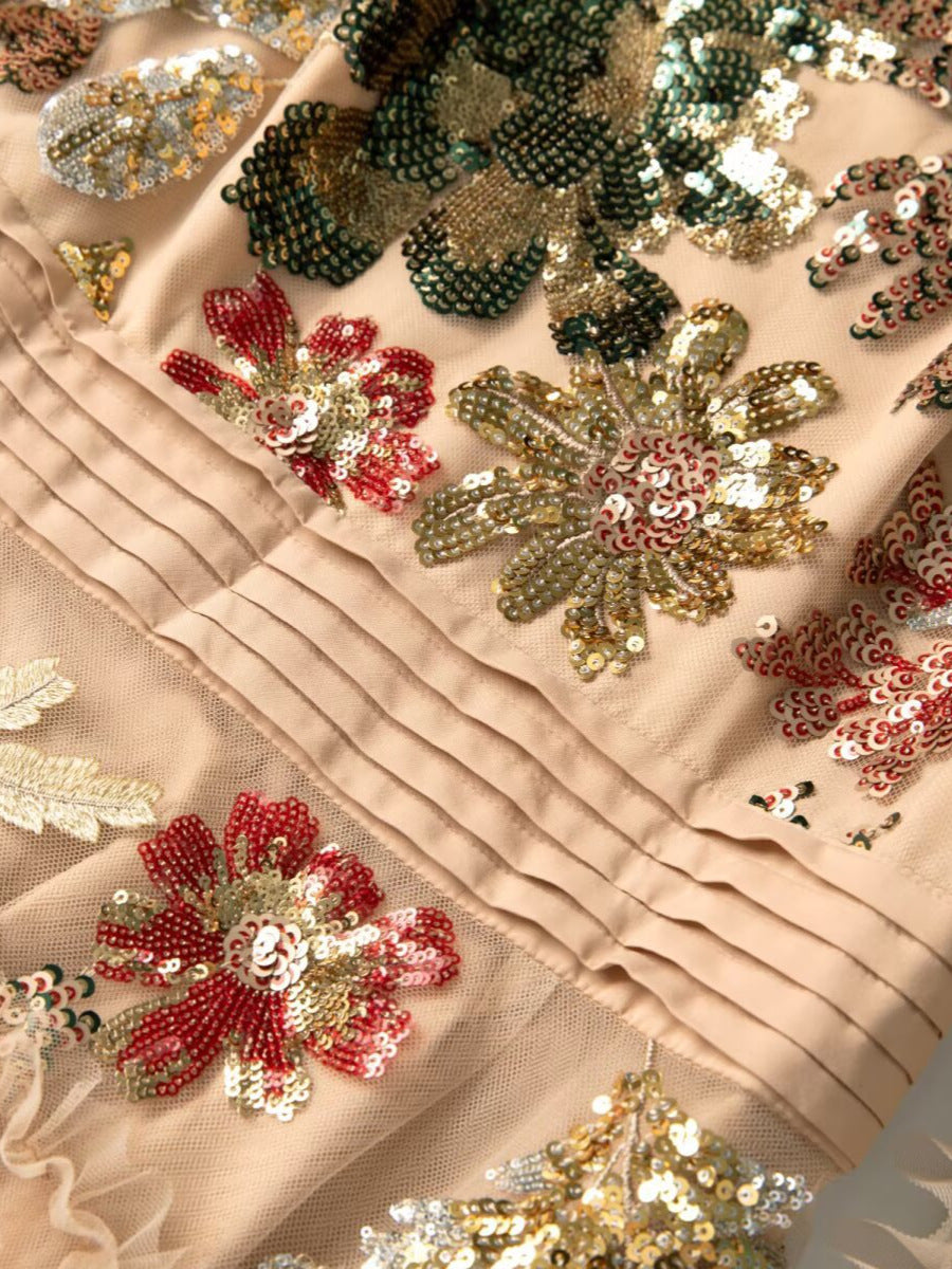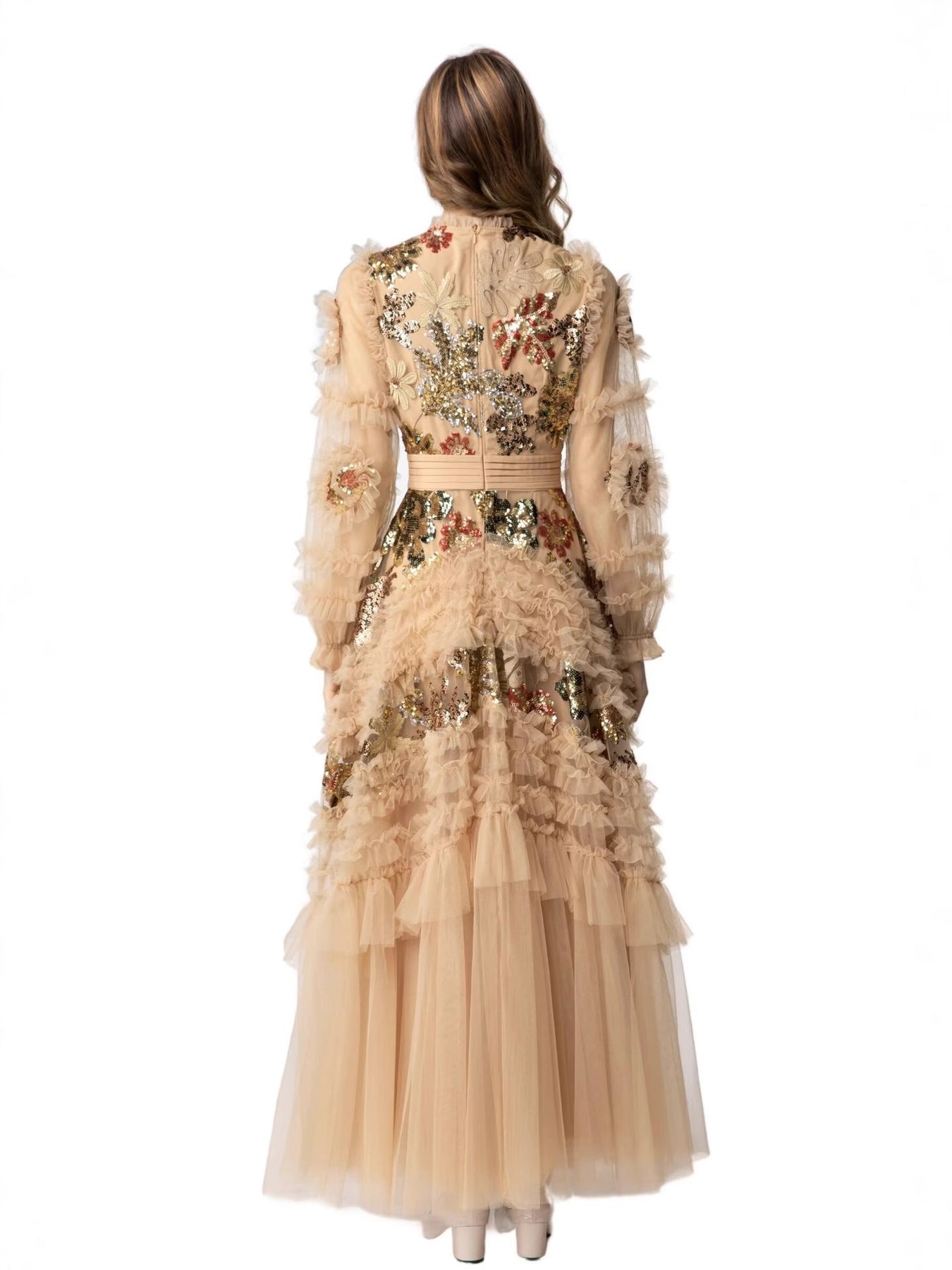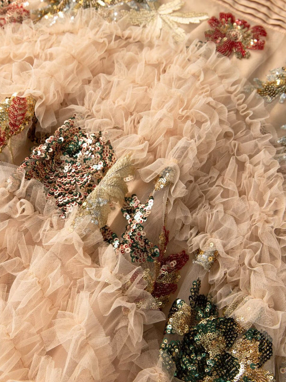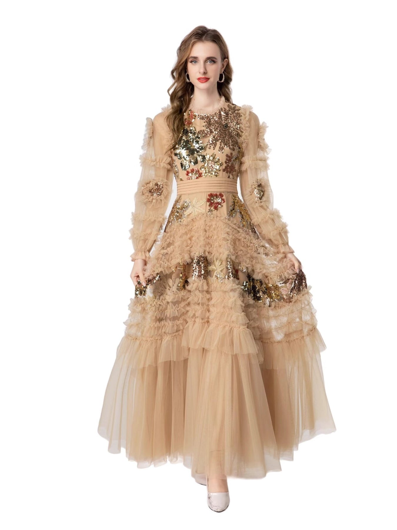 فستان تول شفاف بلون البيج، مزين بتطريزات زهور لامعة على الصدر والتنورة. يتميز بكشكشة متعددة الطبقات، وأكمام شفافة منفوخة، وخصر مشدود، ليمنحكِ أناقة رومانسية مثالية للمناسبات المسائية أو على السجادة الحمراء.