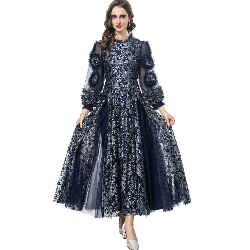 فستان أزرق داكن آسر، مزين بترتر لامع وزخارف زهرية. مصنوع من التول الشفاف بأكمام منفوخة جذابة وطبقات متعددة، ينضح بالرقي والأناقة، مثالي للحفلات والمناسبات المسائية.