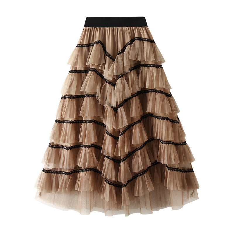 تنورة أنيقة بكشكشة مصنوعة من طبقات متتالية من التول الناعم، مزينة بحواف دانتيل سوداء رقيقة لمزيد من العمق. يُضفي اللون الأزرق الملكي الجريء لمسةً عصريةً لافتة، مثالية لأمسيات أنيقة أو إطلالات نهارية مميزة.