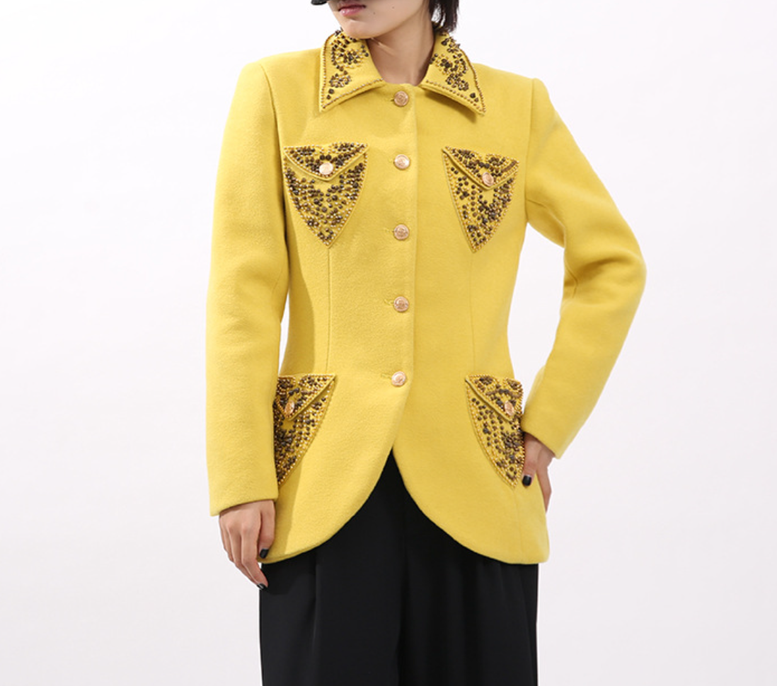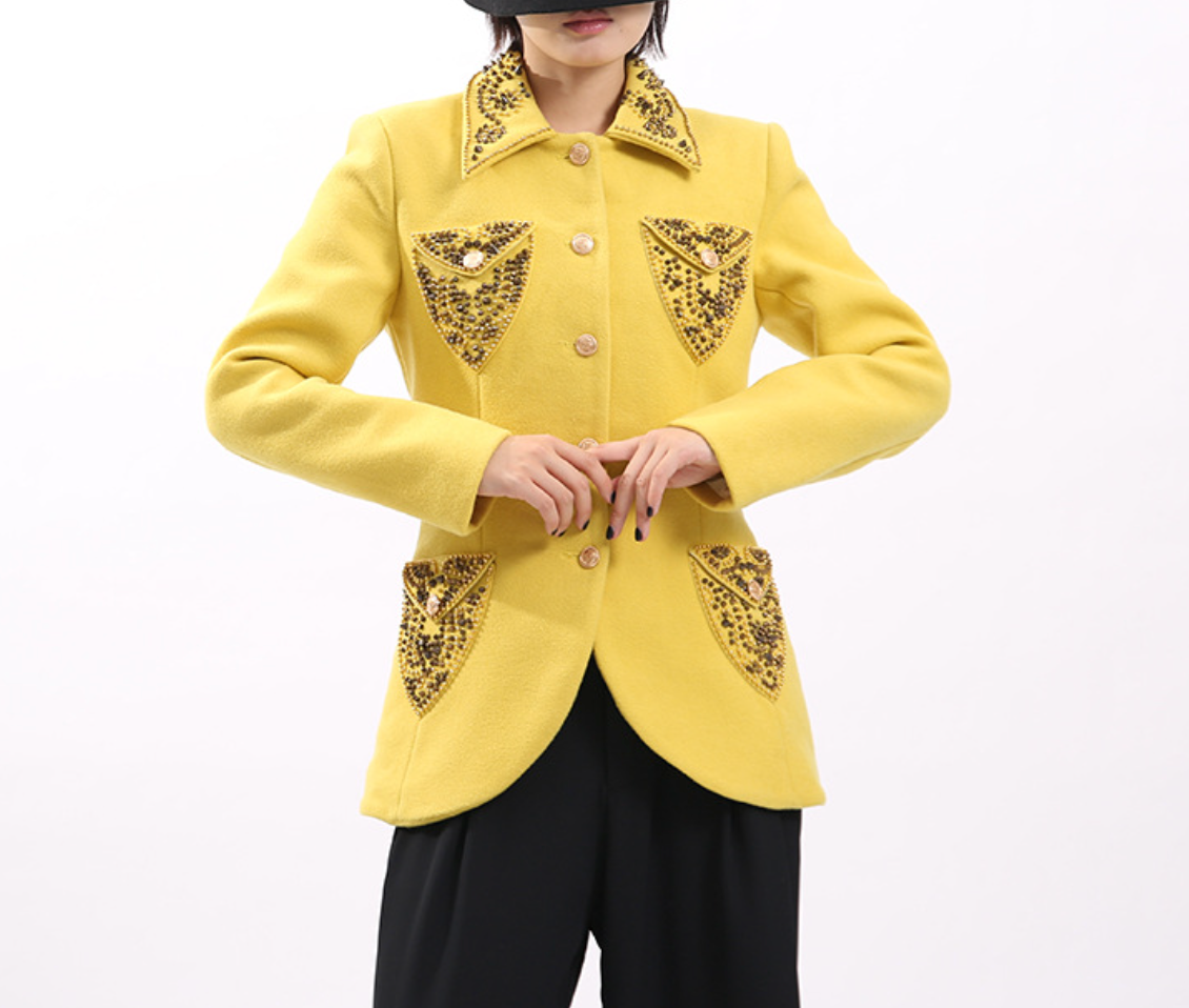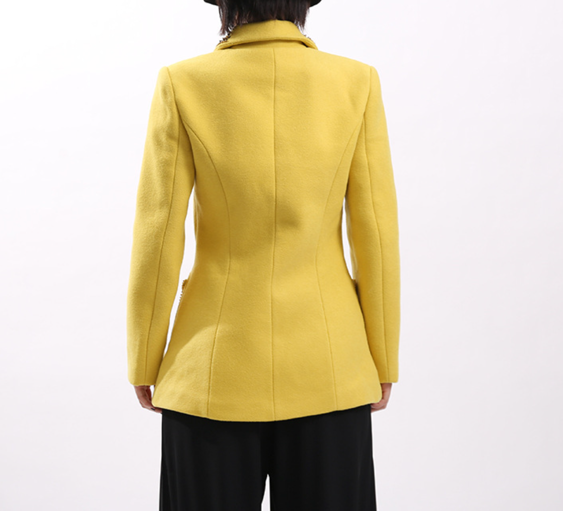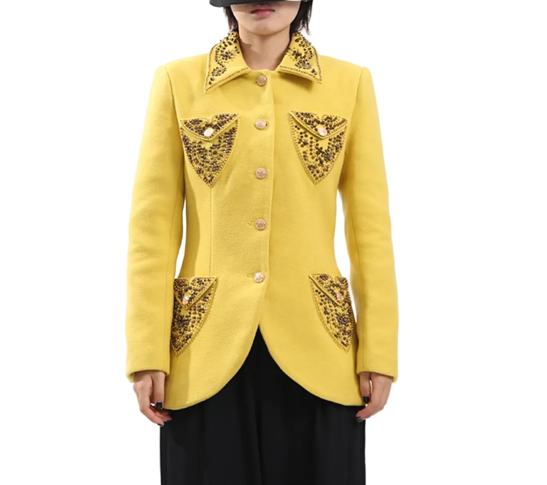 بليزر أنيق مصمم خصيصاً بلون أصفر ذهبي نابض بالحياة، مزين بتطريزات دقيقة على الياقة وأغطية الجيوب. يتميز بتصميم أنيق وقصة محددة وأزرار راقية، يجمع هذا البليزر المميز بين الأناقة والثقة، مما يجعله مثالياً لإضفاء لمسة راقية على إطلالات السهرة أو لإضافة لمسة من الفخامة الجريئة إلى الأزياء العصرية.