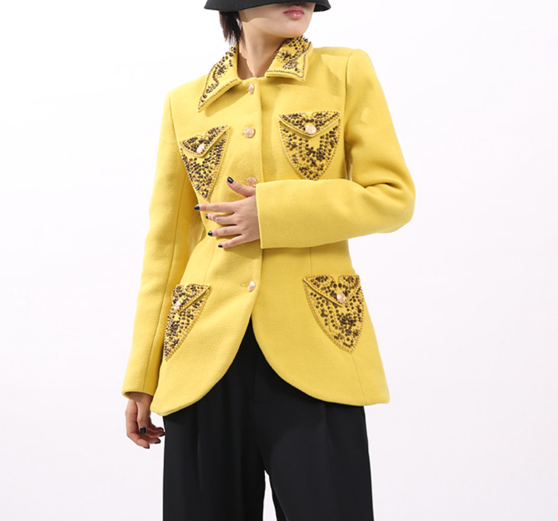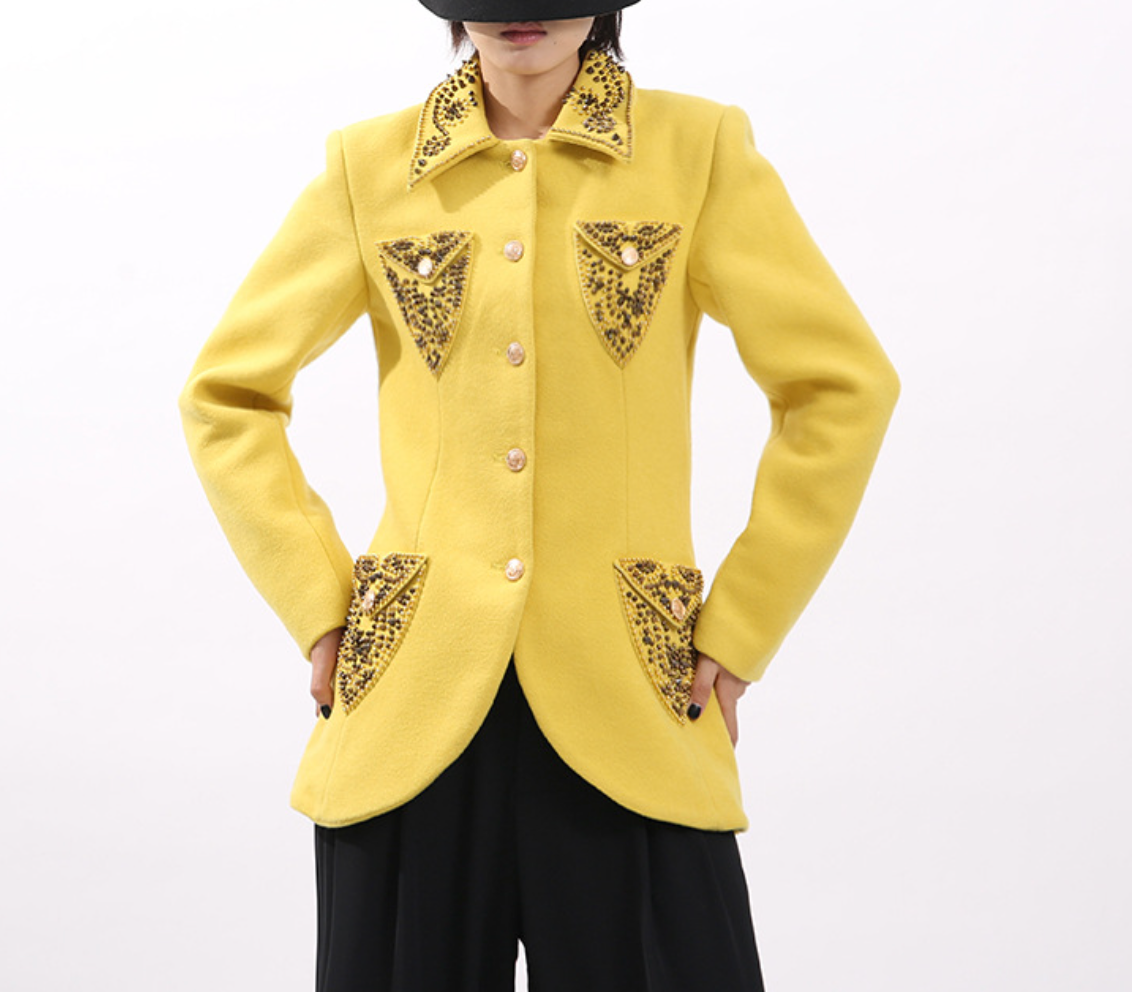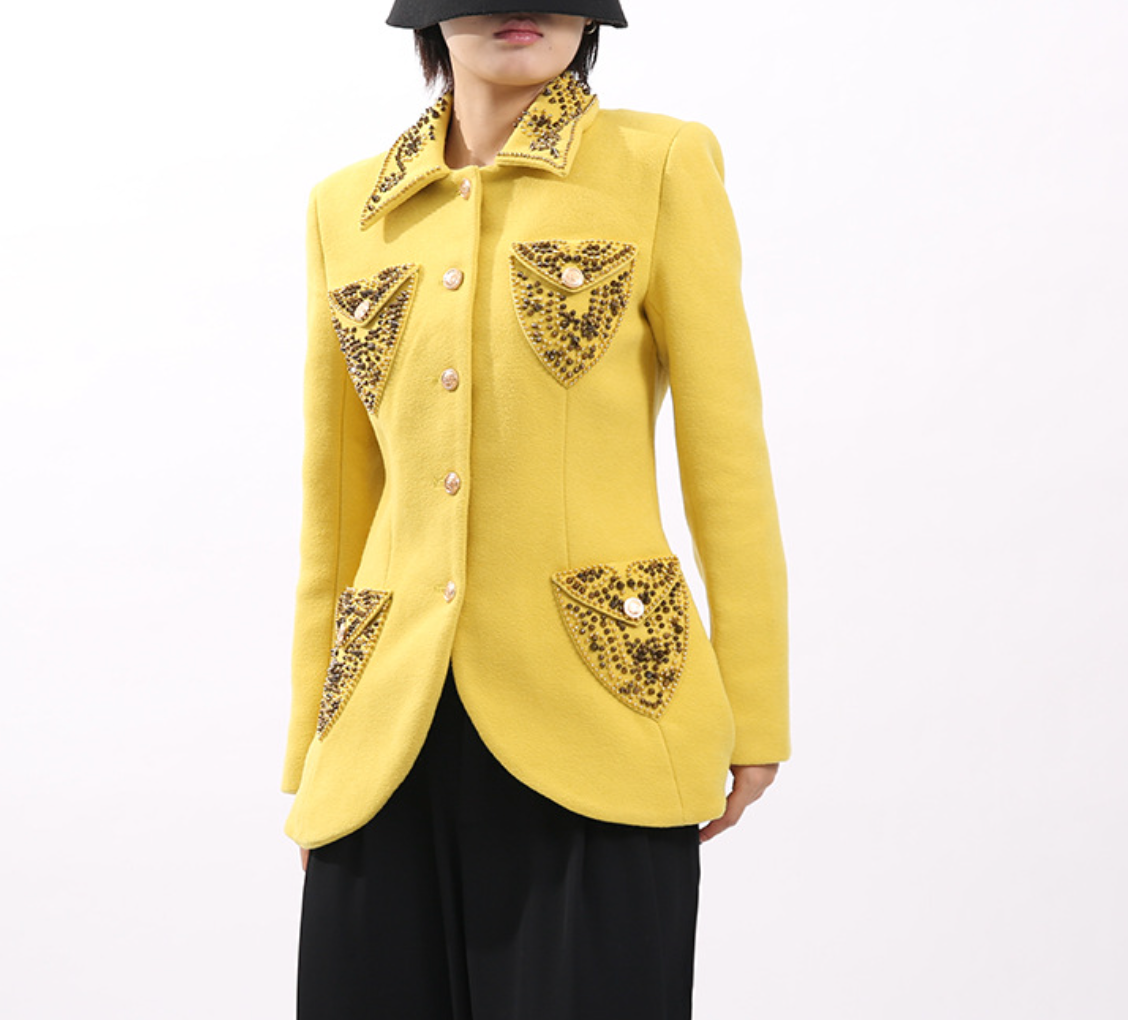 بليزر أنيق مصمم خصيصاً بلون أصفر ذهبي نابض بالحياة، مزين بتطريزات دقيقة على الياقة وأغطية الجيوب. يتميز بتصميم أنيق وقصة محددة وأزرار راقية، يجمع هذا البليزر المميز بين الأناقة والثقة، مما يجعله مثالياً لإضفاء لمسة راقية على إطلالات السهرة أو لإضافة لمسة من الفخامة الجريئة إلى الأزياء العصرية.