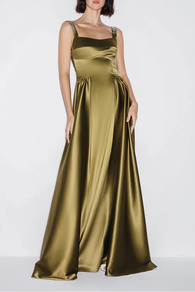 فستان سهرة فاخر من الساتان بلون زيتوني ذهبي غني، يتميز بحمالات كتف مرصعة بالجواهر وصدرية منحوتة تُبرز جمال قوام الفستان. تنورته المنسدلة تُضفي عليه لمسة من الحركة والأناقة، مما يجعله مثاليًا للحفلات والسهرات الرسمية والاحتفالات الراقية.