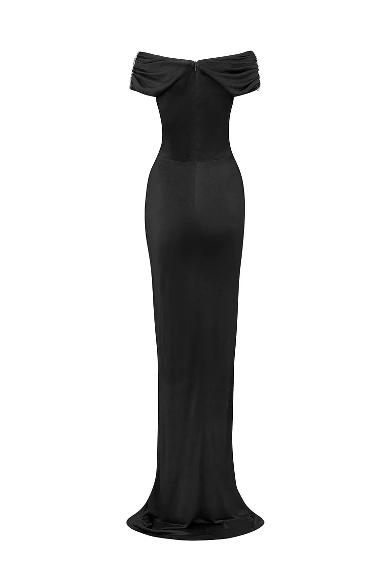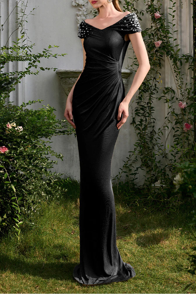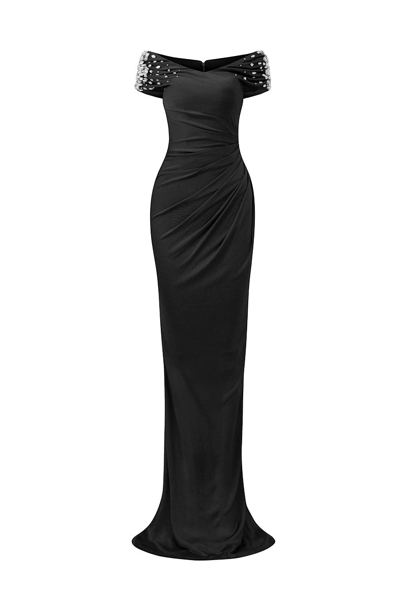 فستان مخملي فاخر مكشوف الكتفين، بأكمام كاب مزينة باللؤلؤ، وخصر منسدل أنيق يُبرز قوام الفستان بأناقة لا مثيل لها. قصته الرفيعة التي تلامس الأرض تُضفي عليه لمسةً عصريةً ساحرة.